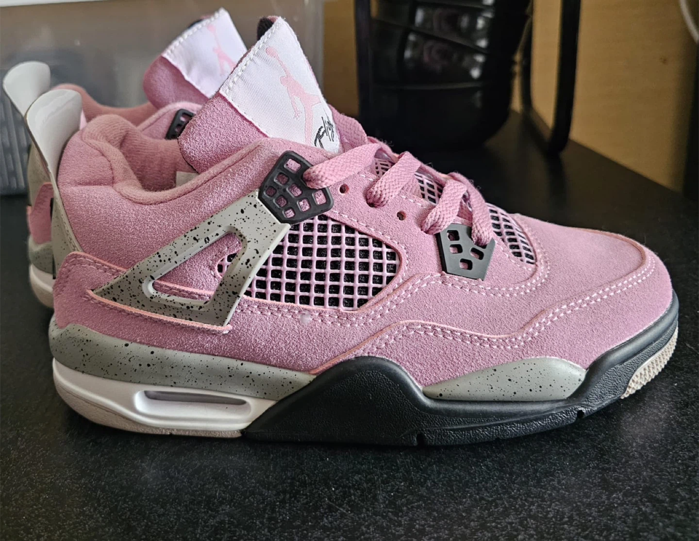 Selling a pair of Jordan 4 Retro A Ma Maniere (GS) shoes! They are in great condition and ready for a new home. The shoes feature a stylish pink color with gray accents.