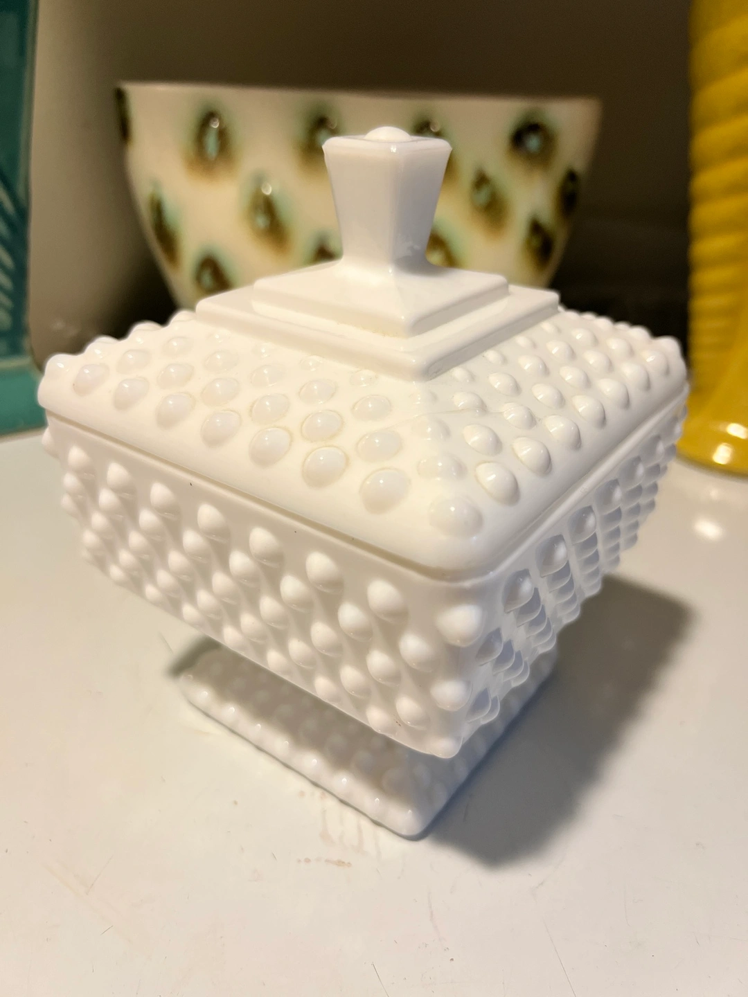 Vintage Fenton or Westnoreland hobnail milk-glass piece with chips underneath the lid which is not visible when on display.