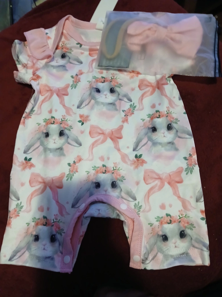 This adorable baby romper features a sweet bunny print with pink bows and floral details. It comes with a matching headband, still in its original packaging. Perfect for your little one!