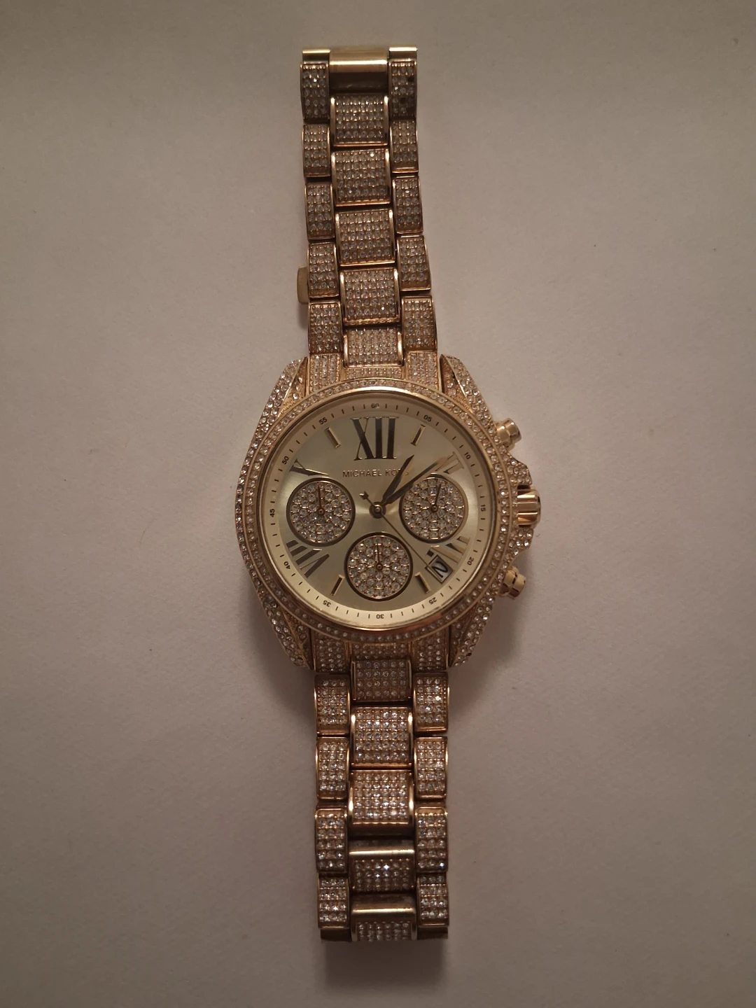 Michael Kors watch with rose gold finish. It's covered in sparkling crystals on the case and band. Features a champagne dial with Roman numerals and three sub-dials. This watch adds a touch of glam to any outfit! Battery NOT included.