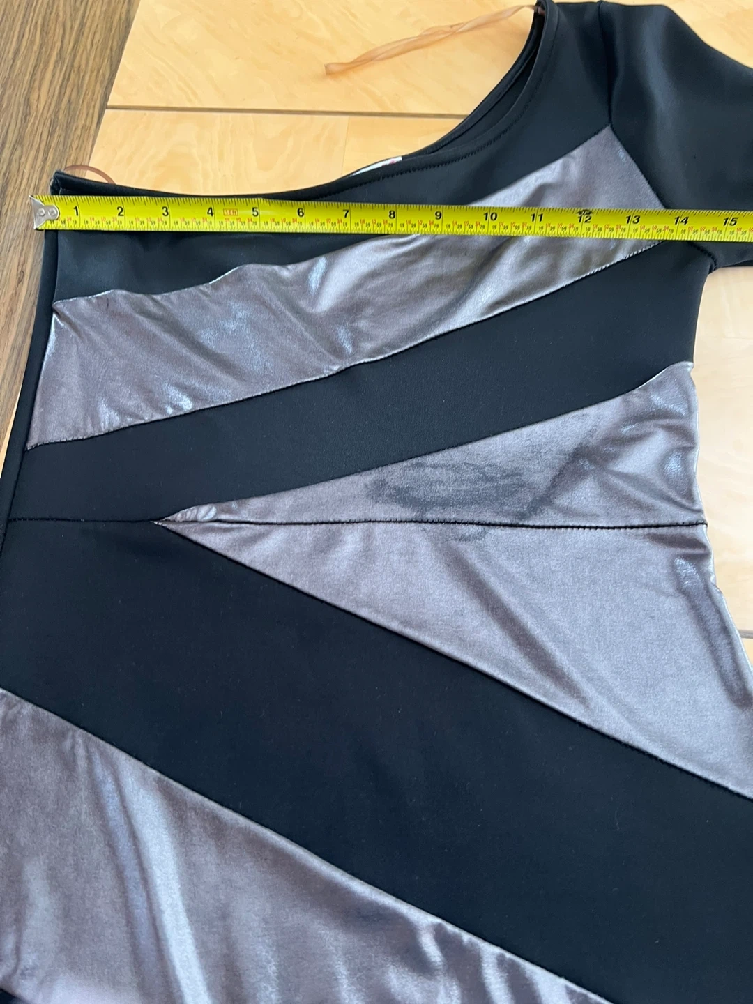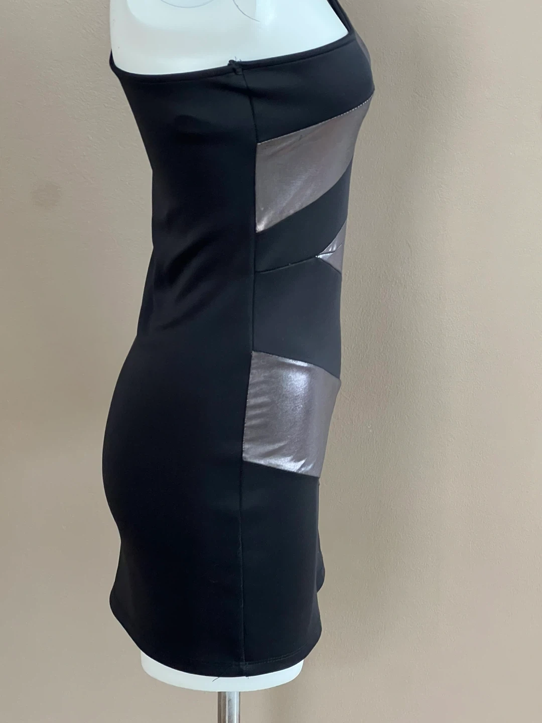 This stylish black dress features a striking one-shoulder design with diagonal silver accent panels. It's a chic option for an evening out. Made from a comfortable, stretchy fabric. The tag is faded and size is not visible, I am wearing size S/M