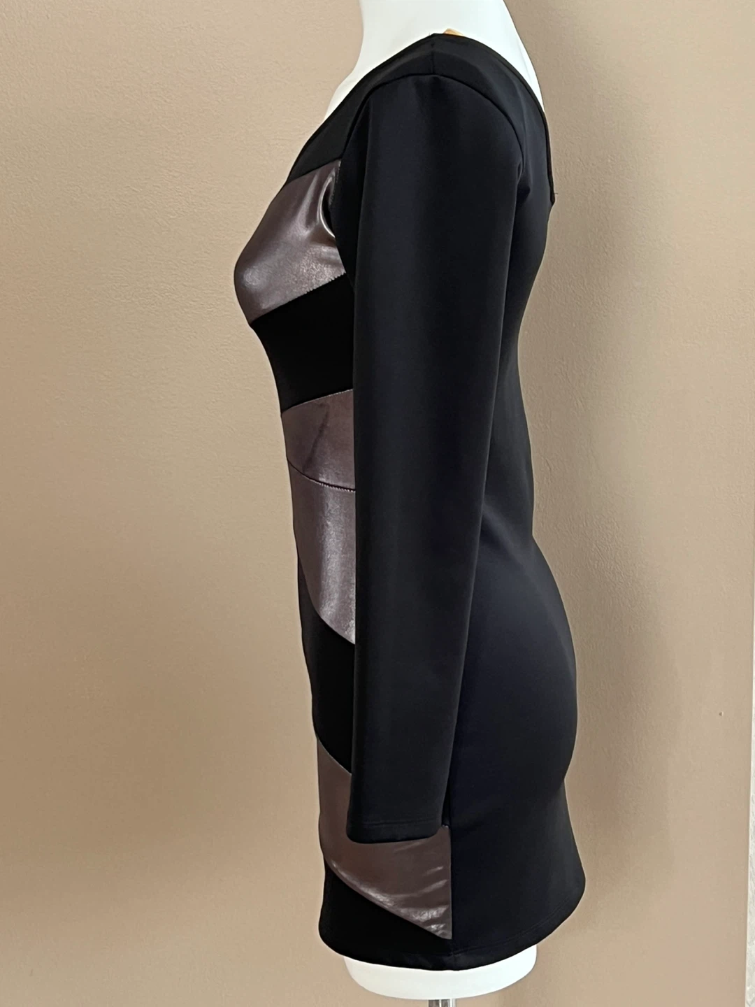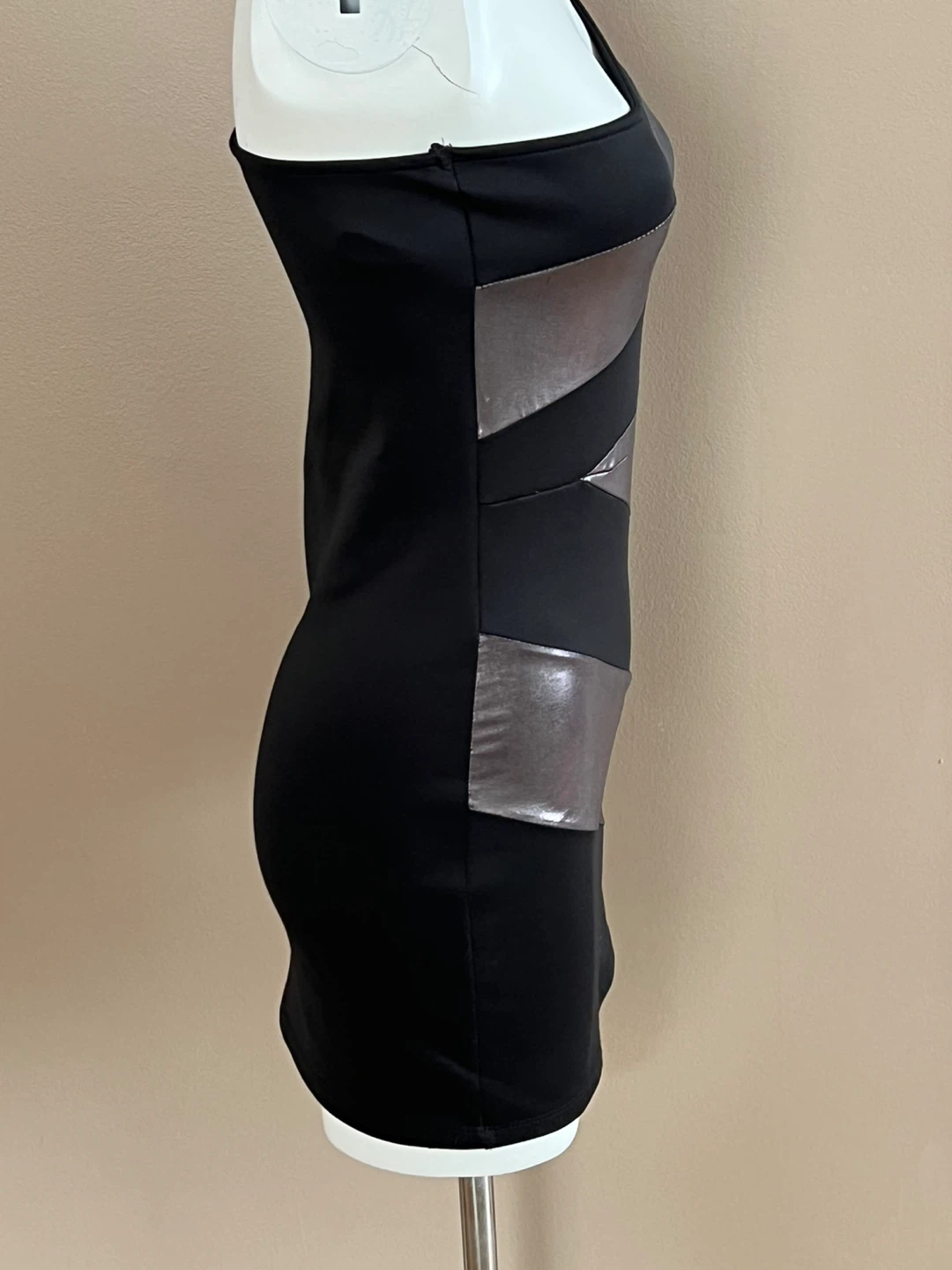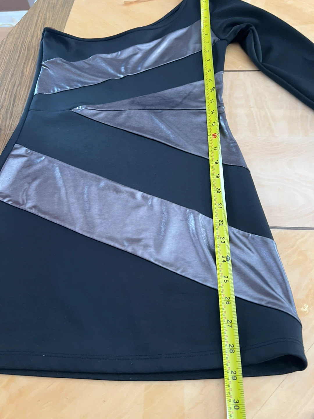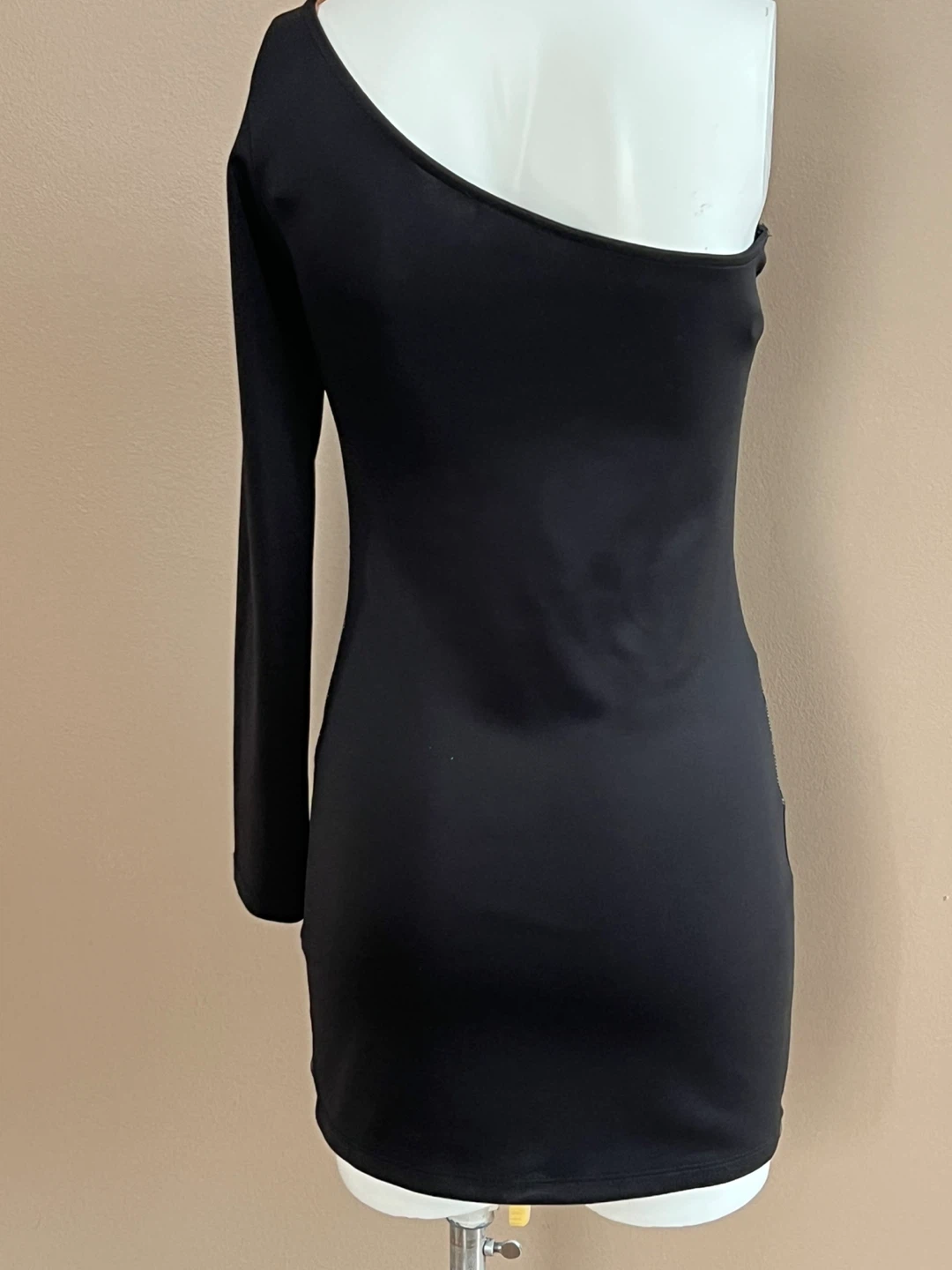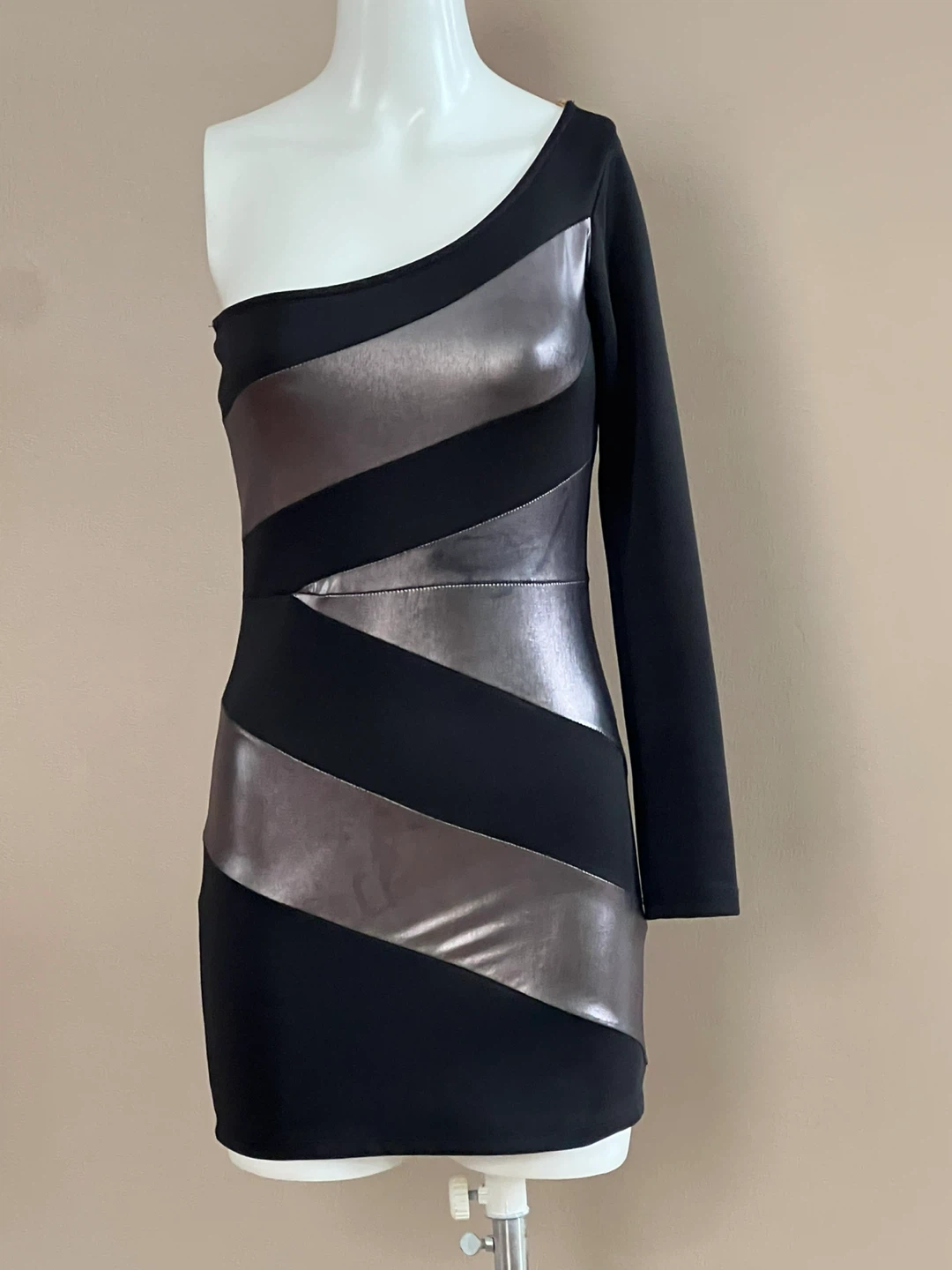 This stylish black dress features a striking one-shoulder design with diagonal silver accent panels. It's a chic option for an evening out. Made from a comfortable, stretchy fabric. The tag is faded and size is not visible, I am wearing size S/M