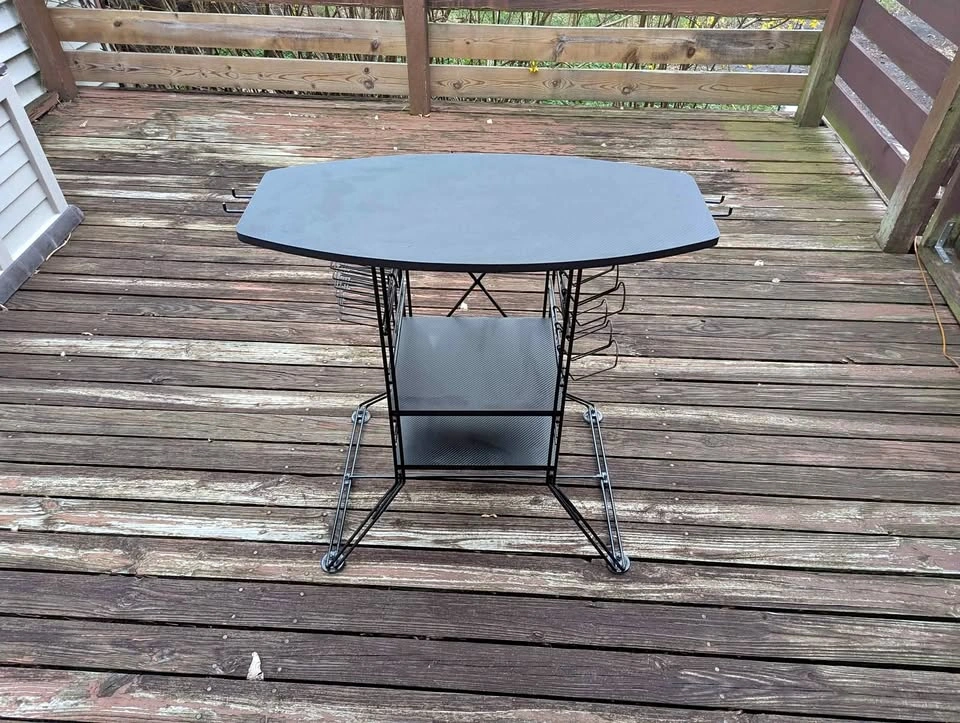 Gaming console TV stand with built-in storage for controllers and game cases.