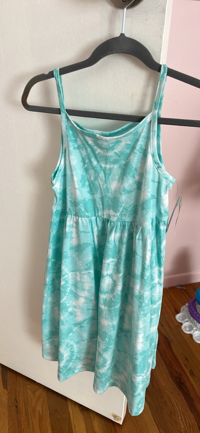 Cute tie-dye dress in a refreshing turquoise and white pattern! Perfect for summer days and casual outings. It's new with tags