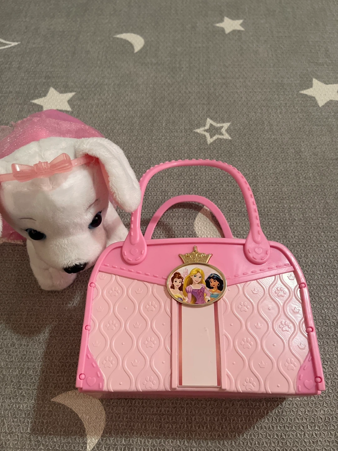 This is a Disney Princess toy purse with a plush white puppy. The purse is pink and features images of Disney princesses. The puppy is also wearing a pink bow and tutu.