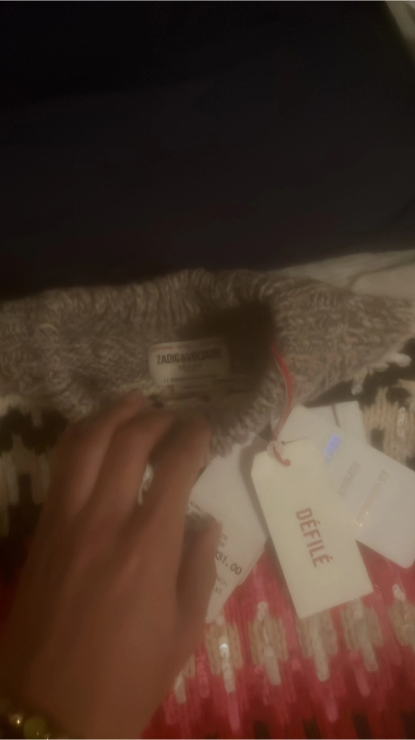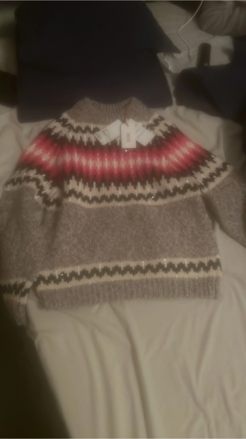 60Cozy Nue sweater with a fair isle pattern in shades of gray and pink. Perfect for staying warm and stylish!