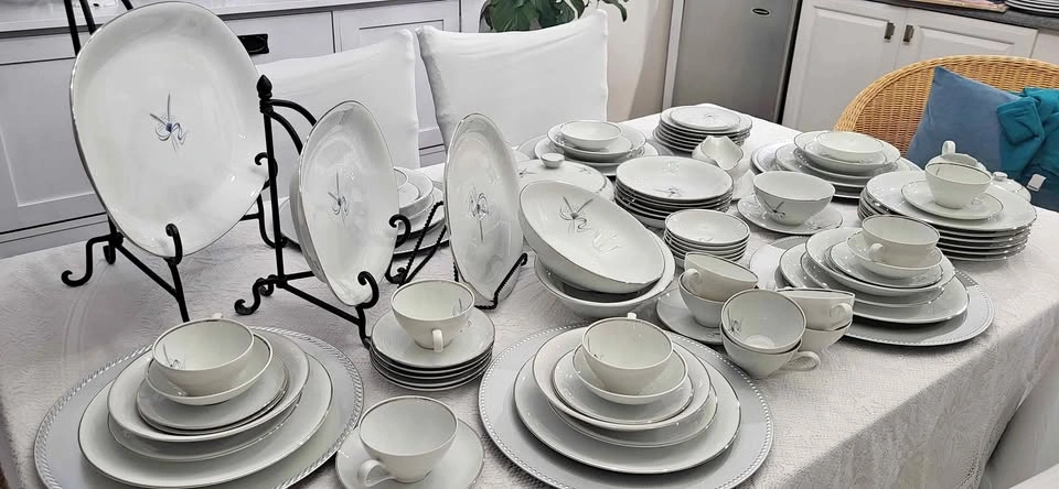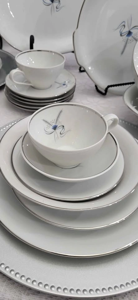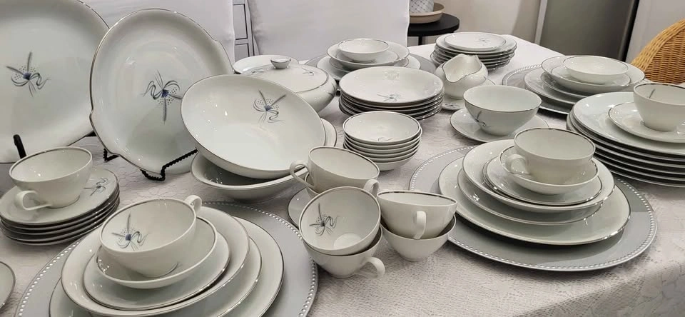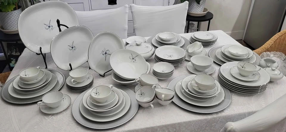 10New, never used. Fine antique porcelain, full set for elegant or formal dinners with full service for 12 people and large full serving set. 12 dinner plates 12 salad plates 12 deep soup plates 12 bread plates 12 medium plates for dessert or fruit 12 cups 12 saucers for cup. DINNER SERVING SET 1 large oval plate for serving turkey 1 medium oval plate for ham 1 large circular deep plate for vegetables 1 circular deep plate for serving salad 1 large flat plate for serving cookies or bread 1 soup bowl (pot) with lid 1 medium round bowl with base For sauce. 1 medium oval gravy bowl 1 creamer 1 sugar bowl with lid. 96 pieces...FULL SERVICE FOR 12.. $325 CASH ONLY ACCEPTED. LOCATED IN ALSIP MORE ITEMS ON MY PROFILE.