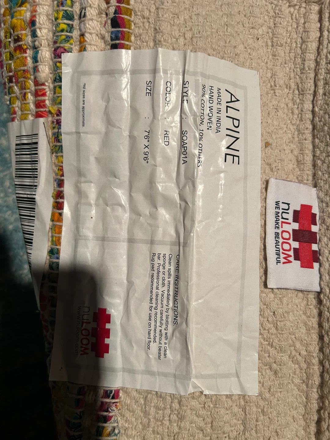 80I'm selling a nuLOOM Alpine hand-woven rug. It's made of 90% cotton and 10% other materials. The color is Soapdia Red, and the size is 7'6" x 9'6" Brand new, rolled out but wrong size for the office and rolled back up. Originally bought for over 300.00.