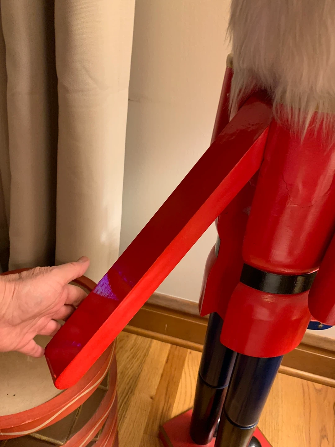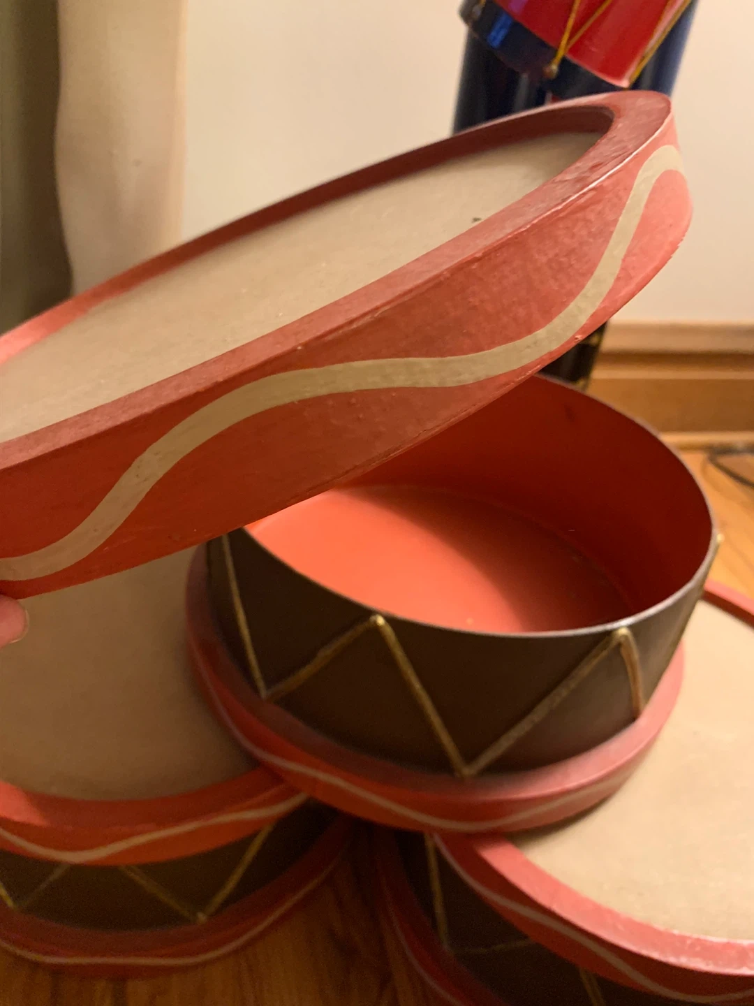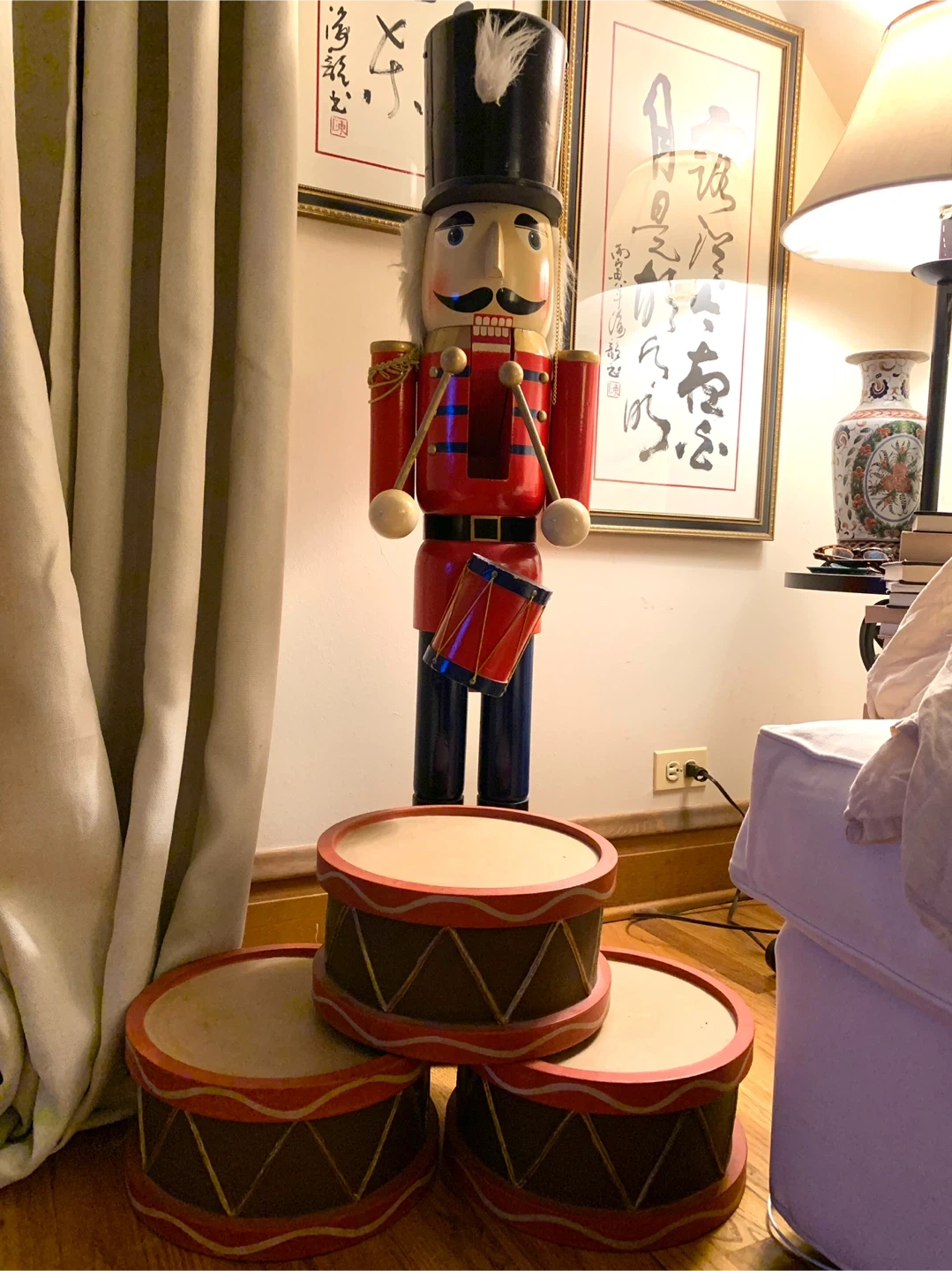 15Selling a nutcracker soldier figure with a drum set. The nutcracker has a black top hat and is dressed in a red and blue uniform. The drum set consists of three drums. Vintage Collection