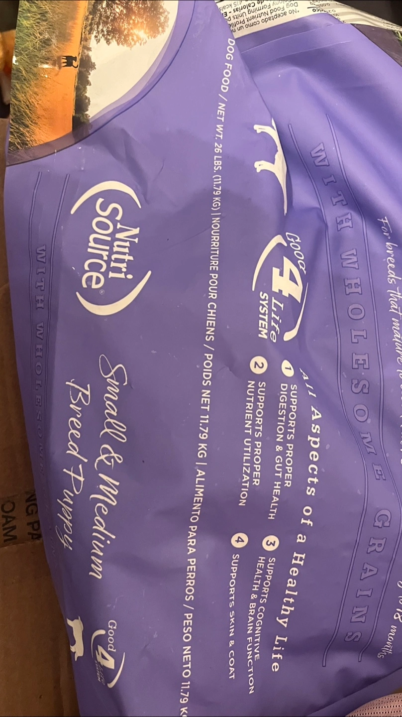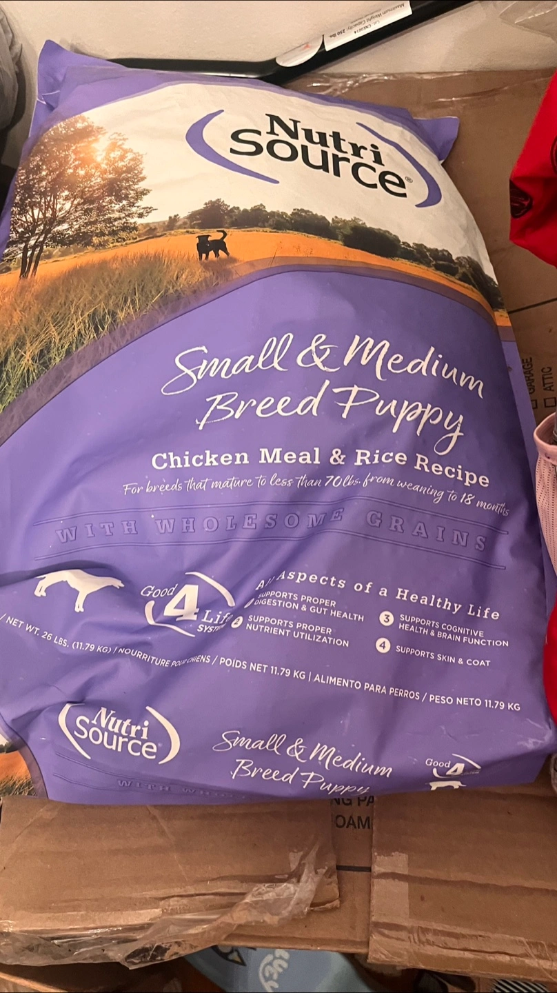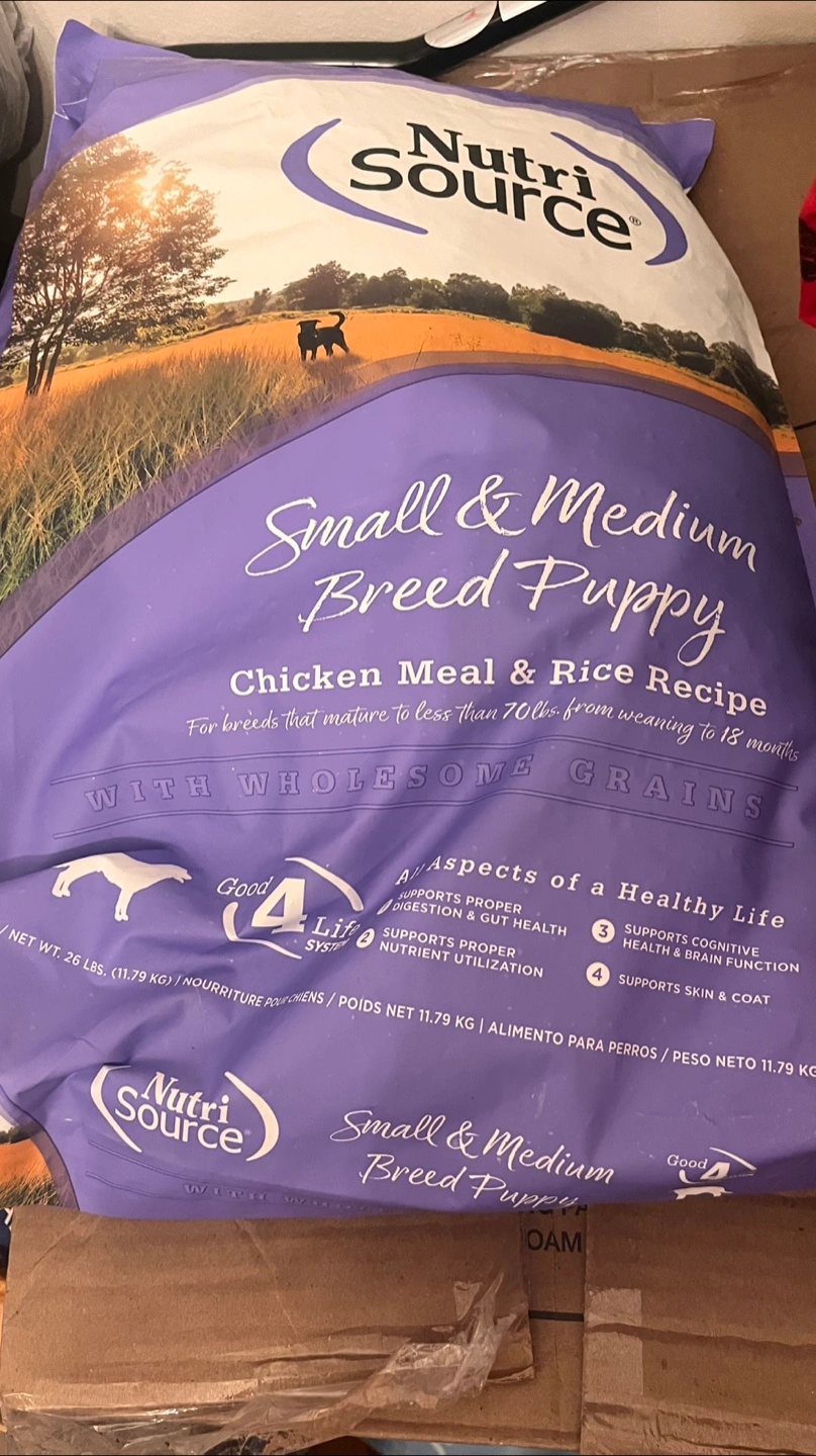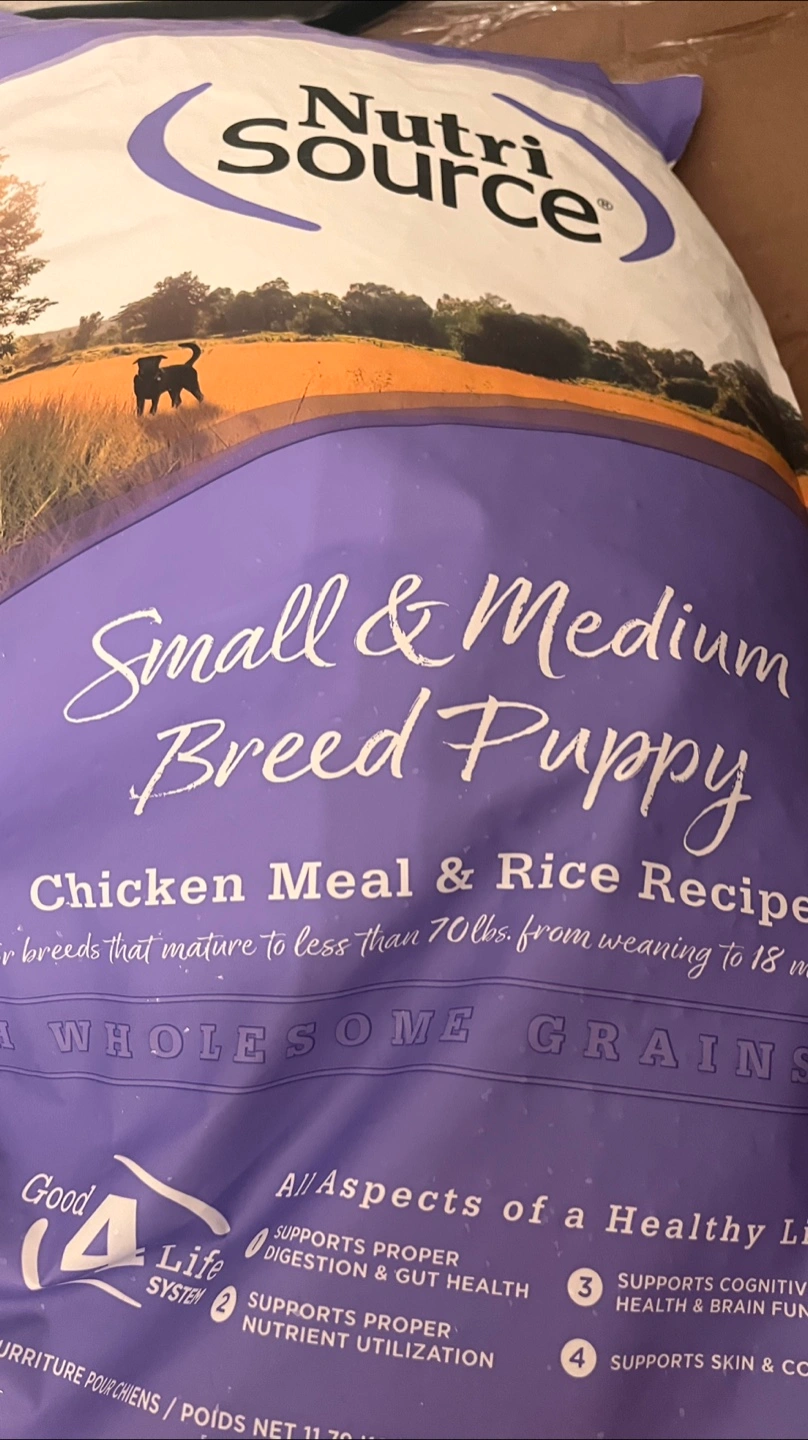 Selling a bag of NutriSource Small & Medium Breed Puppy food. It's a chicken meal and rice recipe, perfect for breeds that mature to less than 70lbs from weaning to 18 months. It also supports proper digestion and gut health, nutrient utilization, cognitive health and brain function, and skin and coat