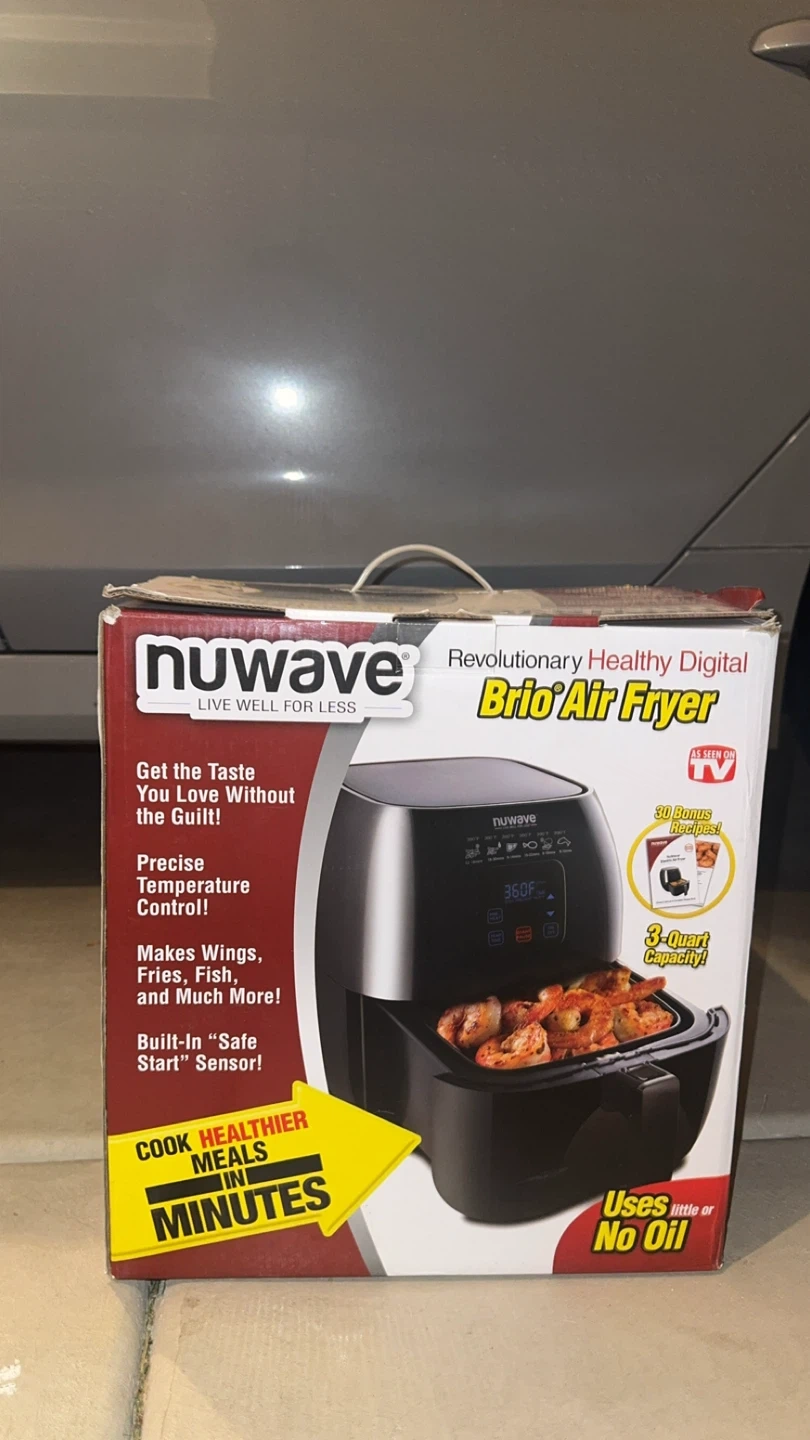 I'm selling a NuWave Brio Air Fryer! It's a revolutionary healthy digital air fryer that lets you get the taste you love without the guilt. It has precise temperature control and makes wings, fries, fish, and much more! It also has a built-in "Safe Start" sensor and a 3-quart capacity