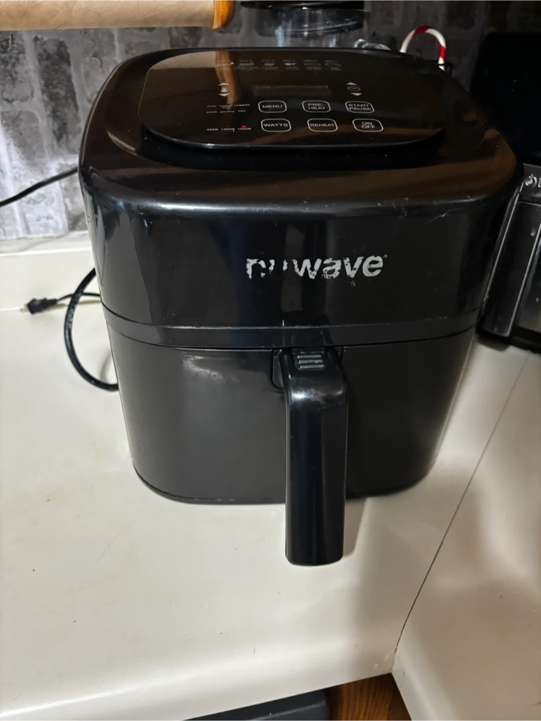 10Selling a NuWave Brio Air Fryer! It's black and in good condition. It has a digital display and different settings for fries, frozen nuggets, steak, poultry, and fish. It can be set to different wattages, too!
