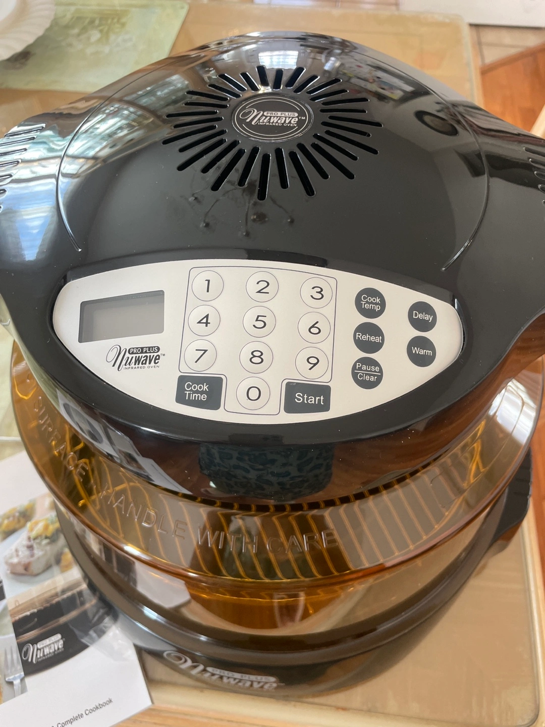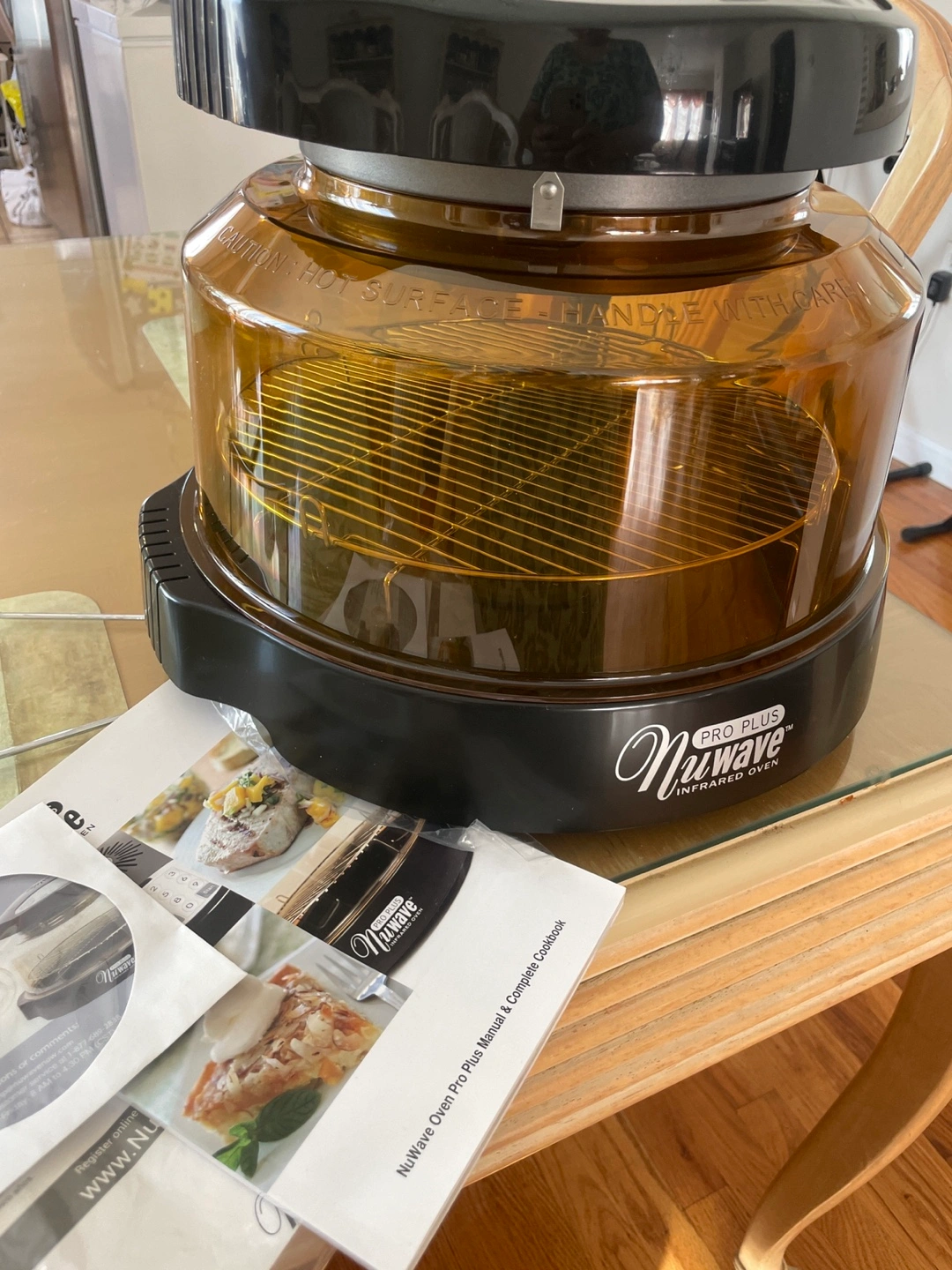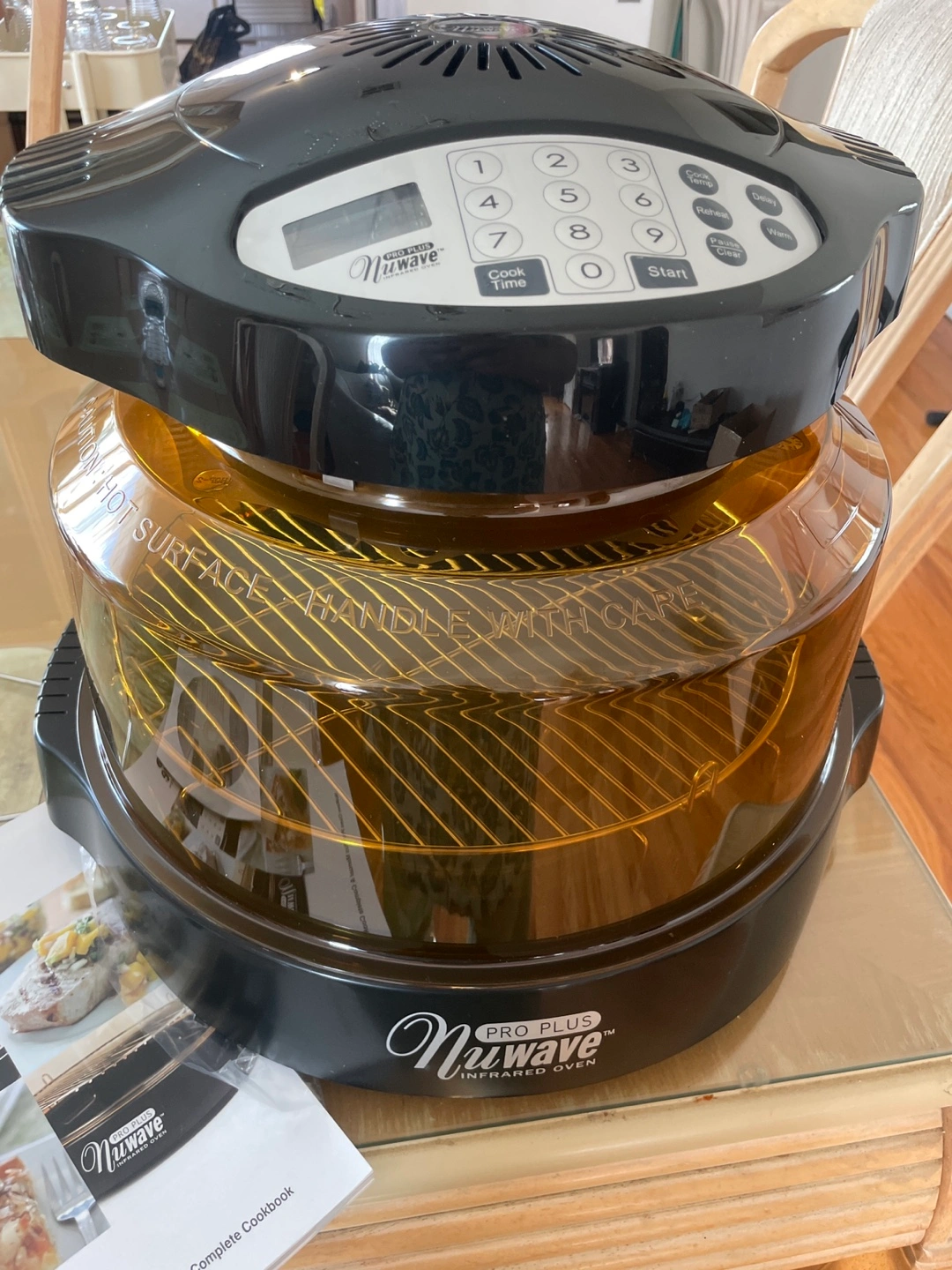 Infrared oven with digital controls. Includes cookbook. Amber-colored oven dome. Black base.