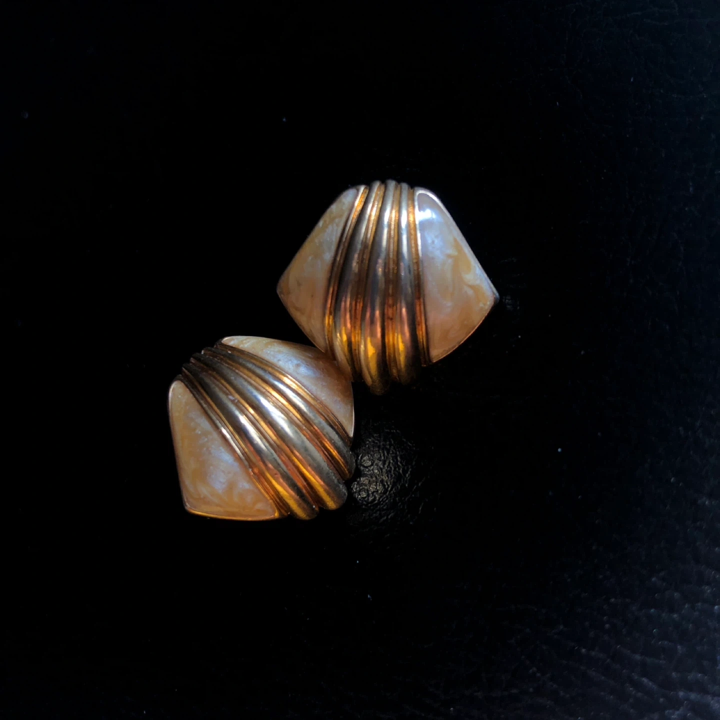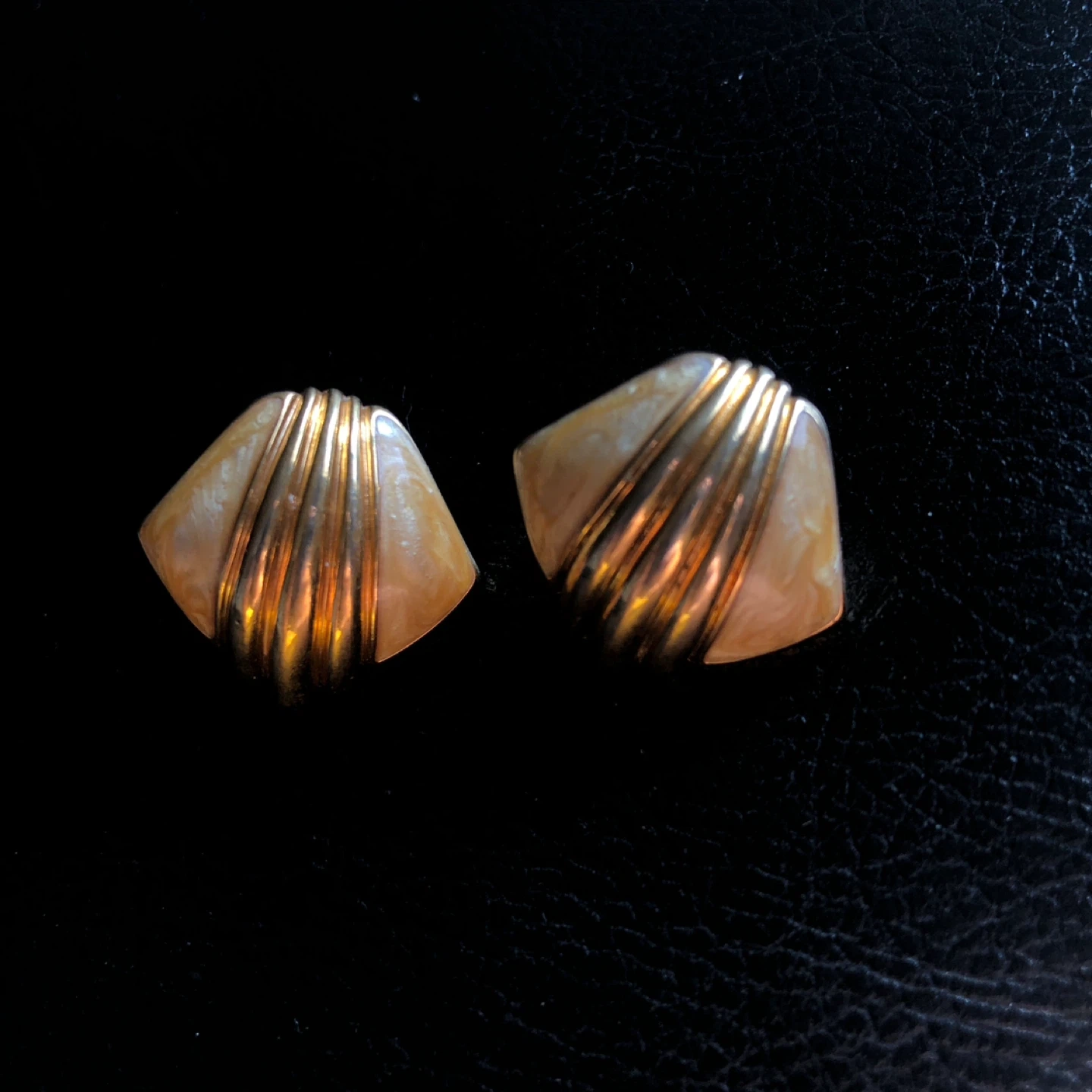 These are vintage earrings featuring a fan design. They have a gold-tone metal base with a pearl-like enamel inlay. These earrings add a touch of classic style to any outfit!