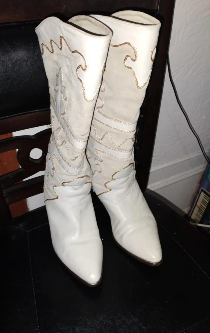Selling a pair white leather boots with a unique embroidered design. These boots are eye-catching and stylish, perfect for adding a touch of flair to any outfit. They show some signs of wear, as pictured.