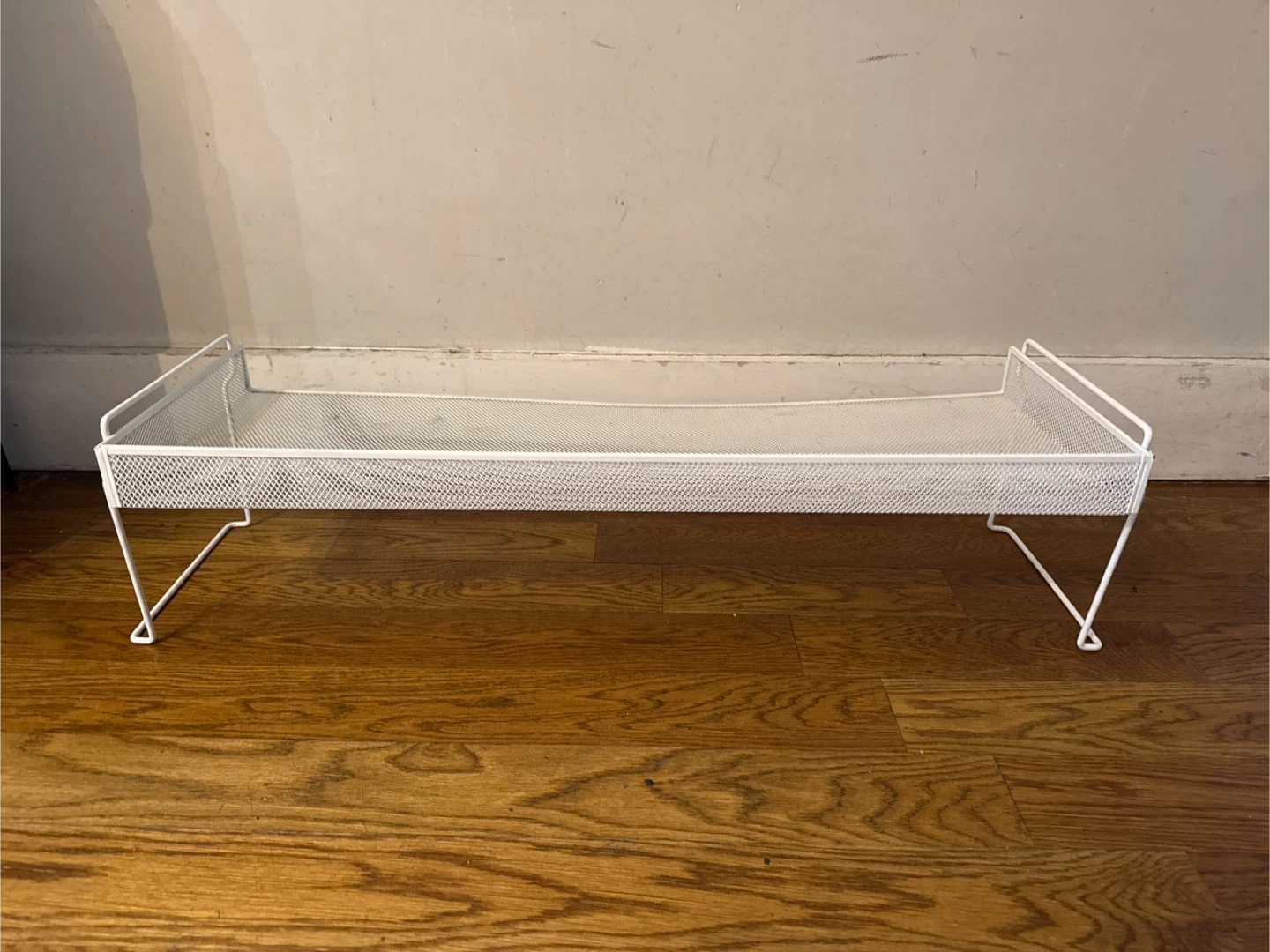 White metal mesh shelf organizer. It's constructed from durable metal. Great for adding extra storage space on desks or countertops!
