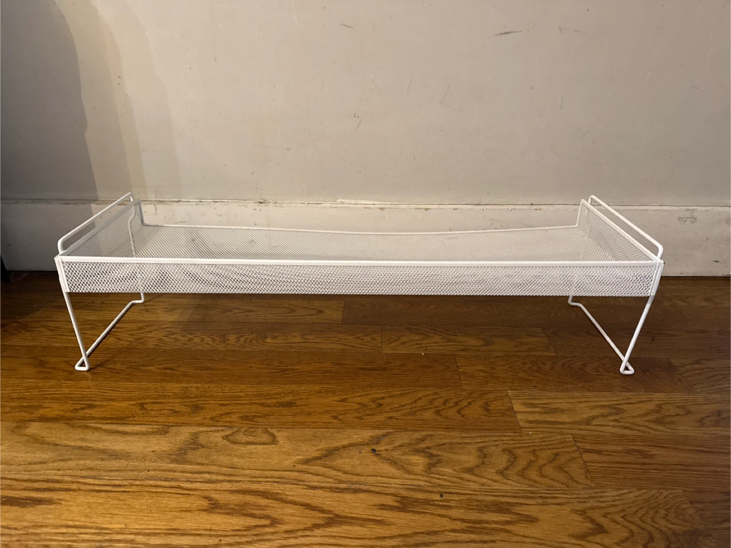 White metal mesh shelf organizer. It's constructed from durable metal. Great for adding extra storage space on desks or countertops!