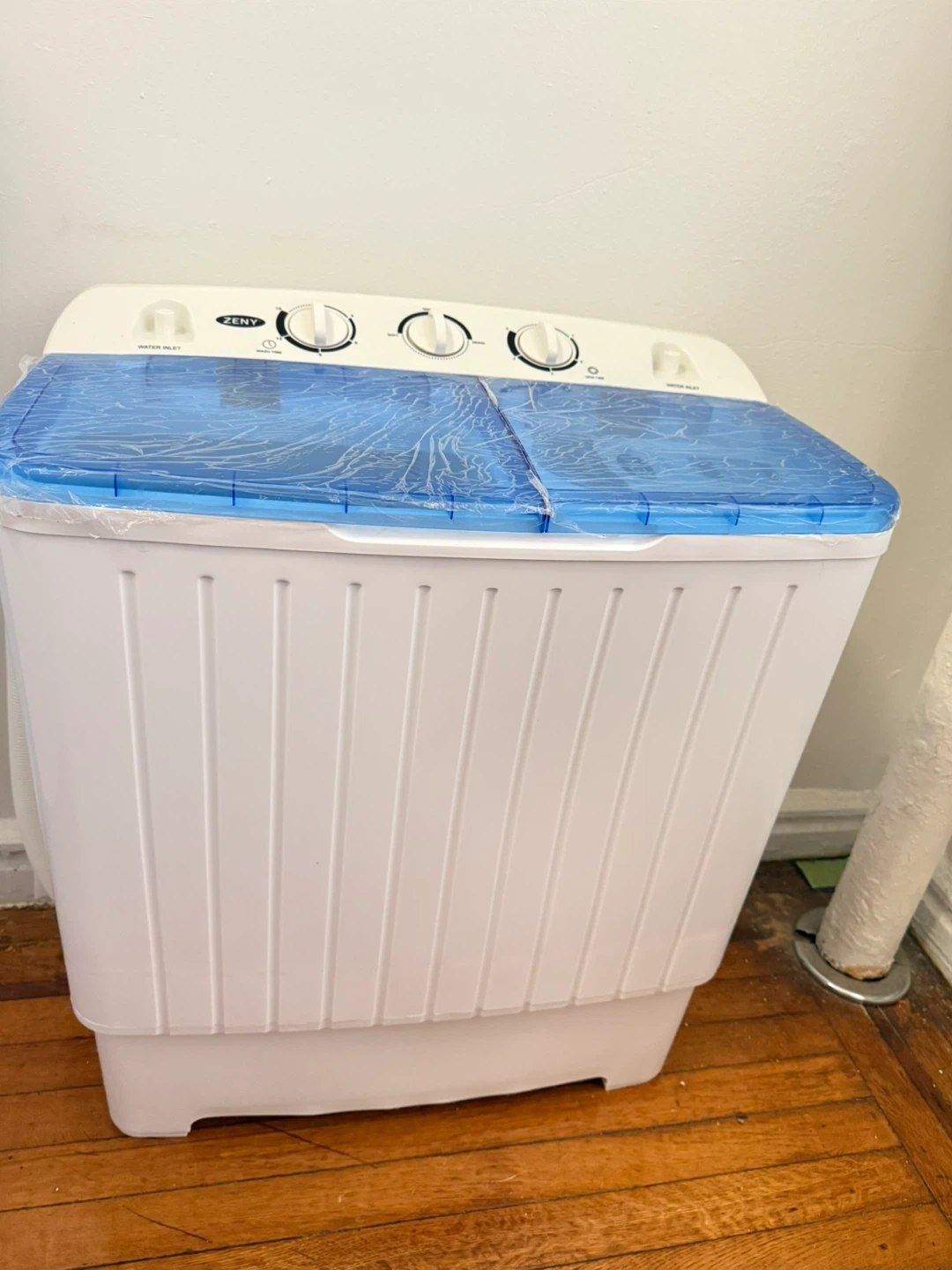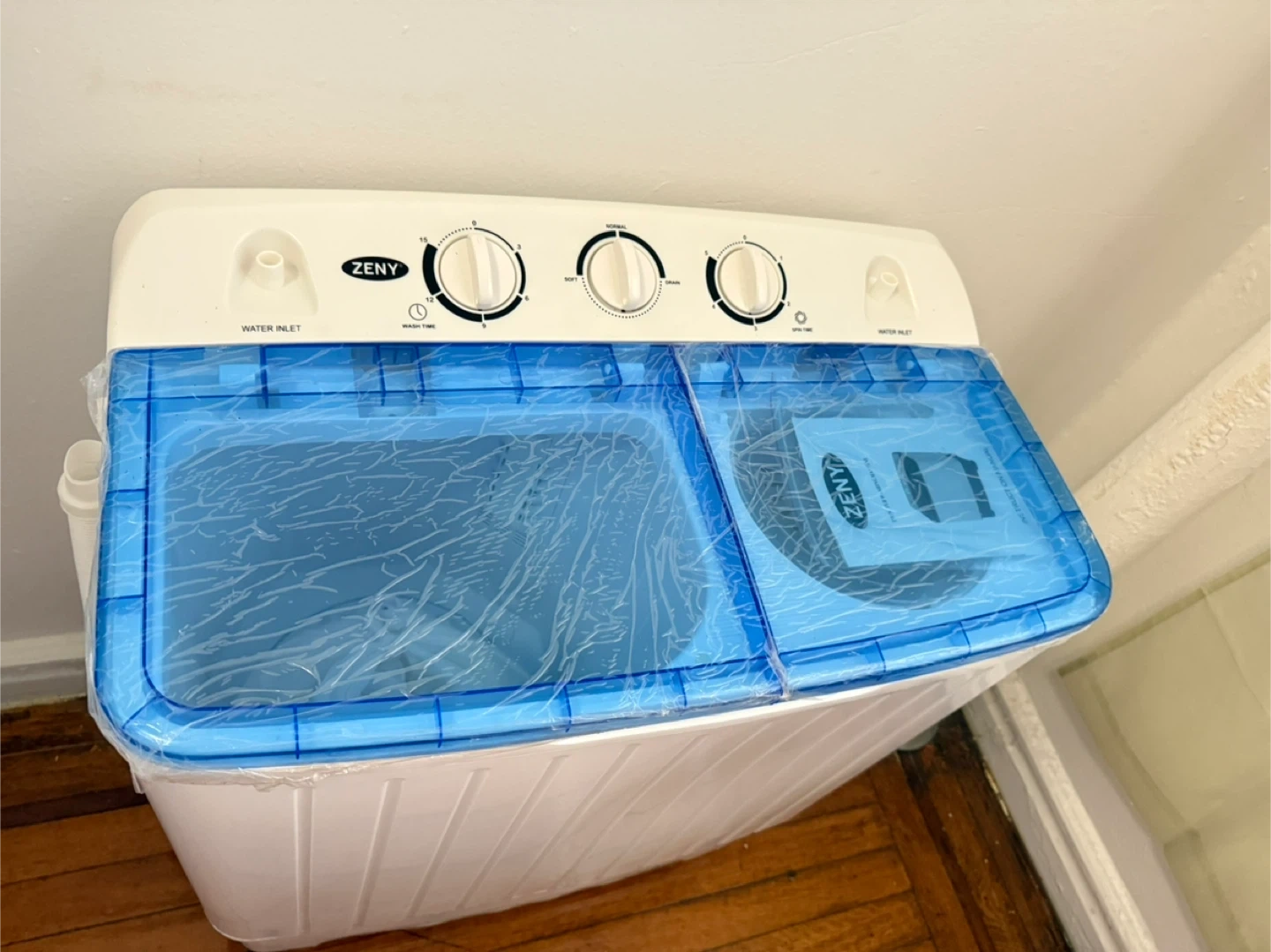This is a ZENY twin tub portable washing machine. It features a washer and a spinner. It's ideal for small loads and quick washes. Includes drainage hose and water inlets.