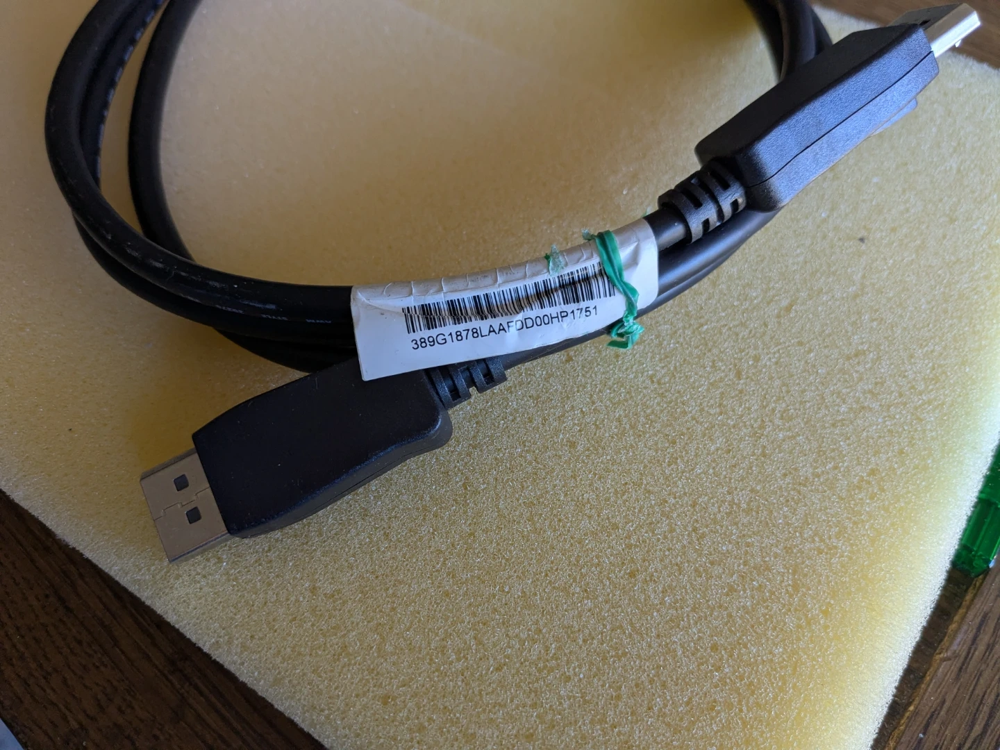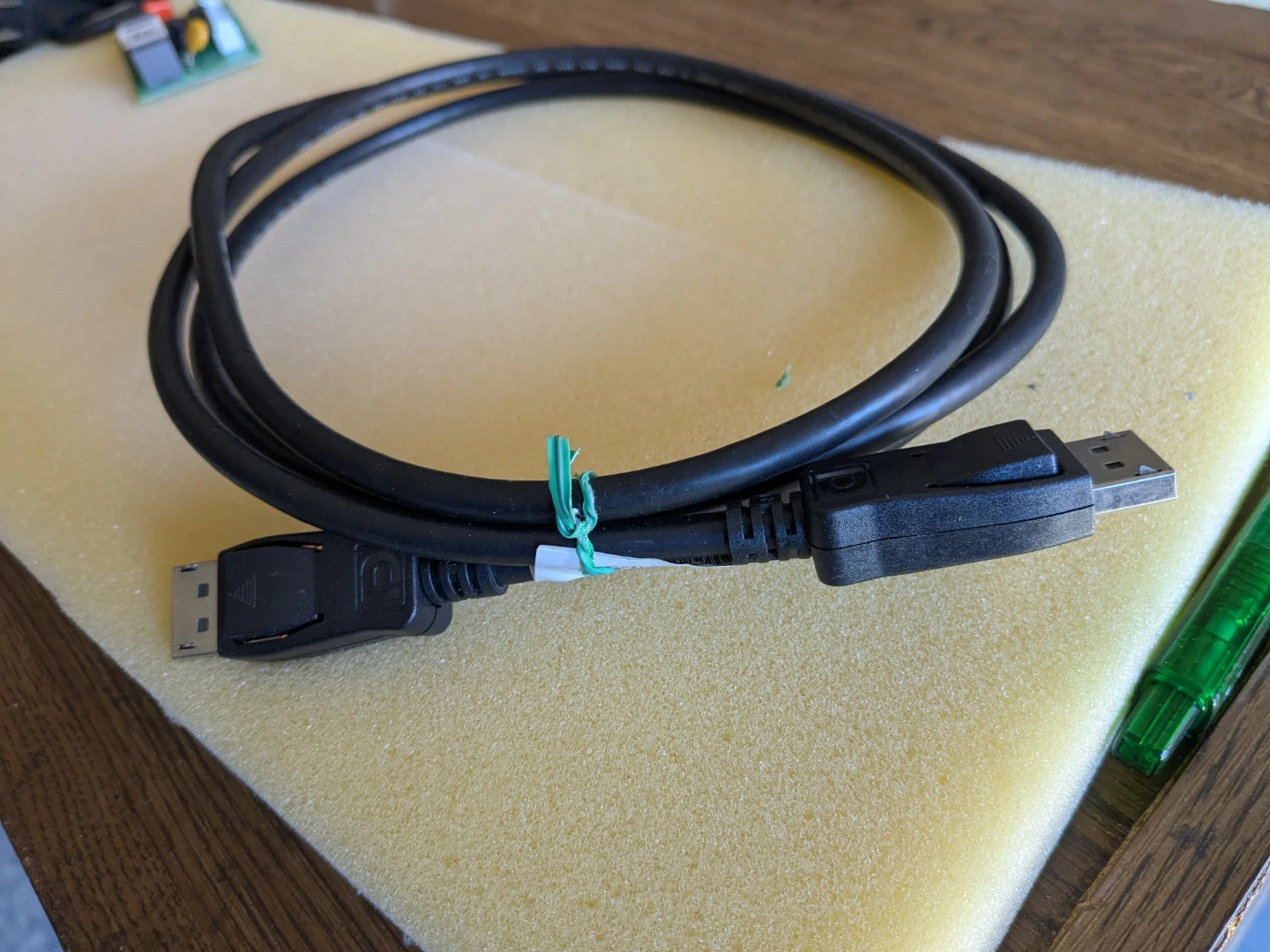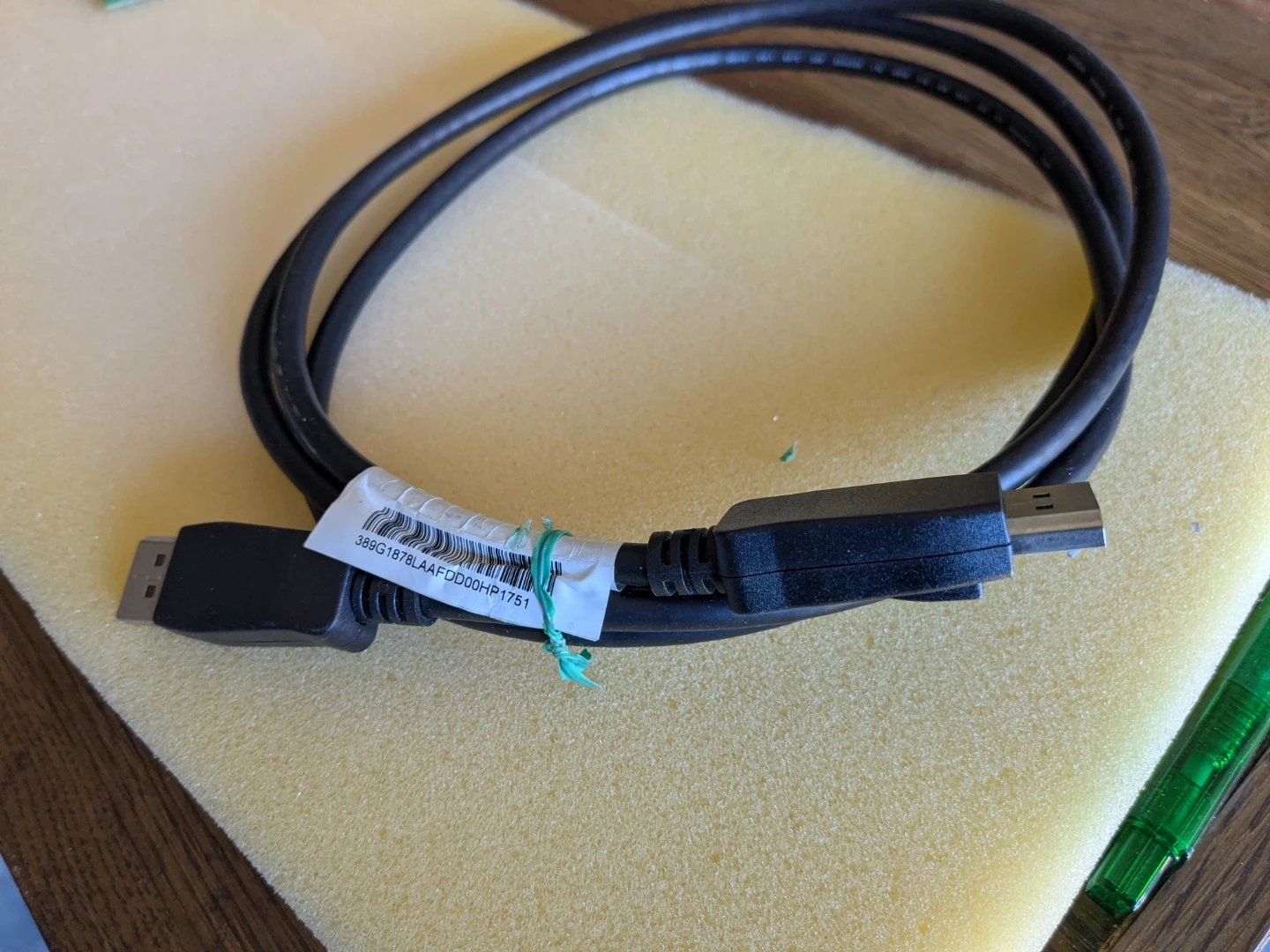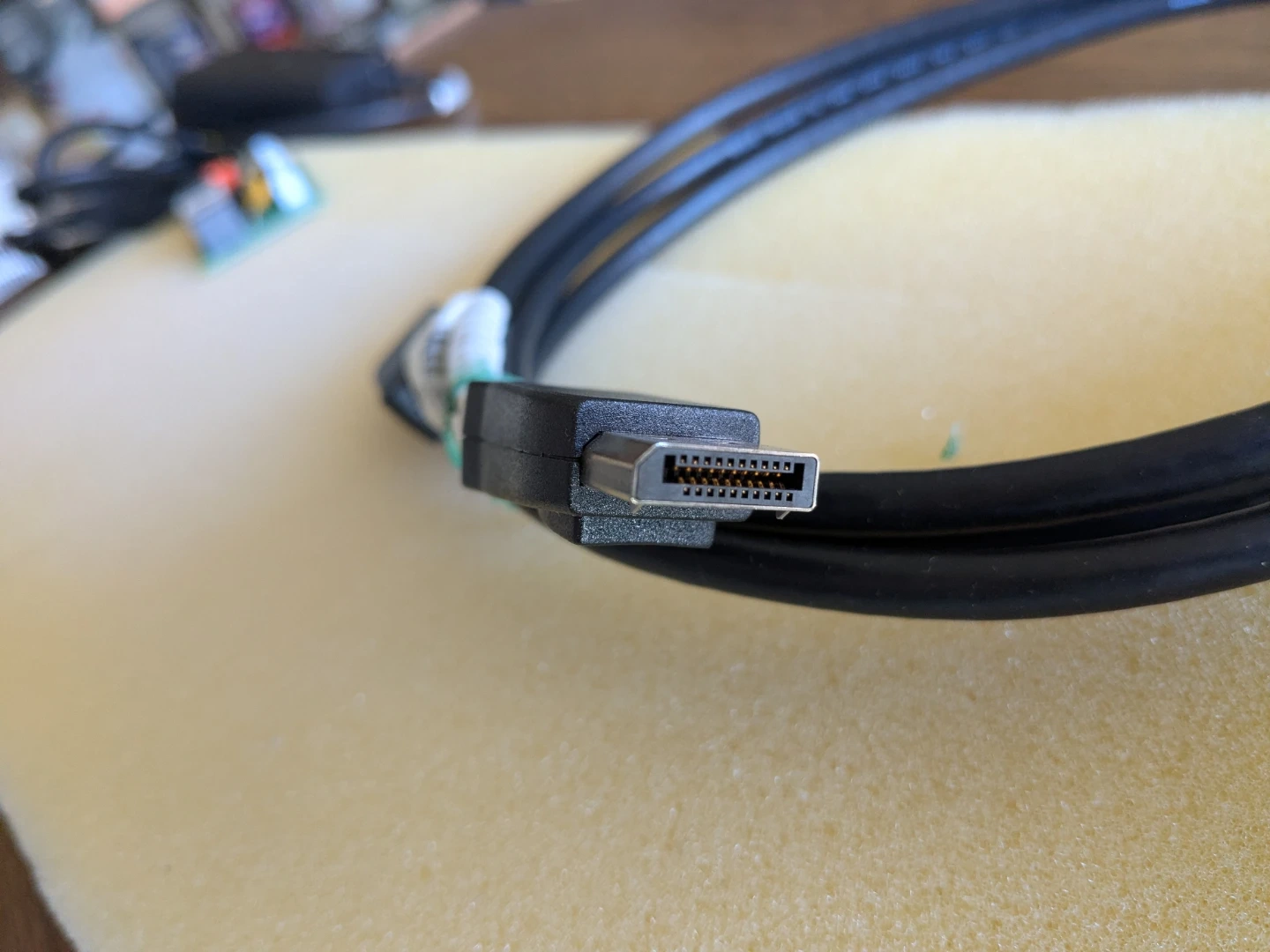 This is a DisplayPort cable. It has a DP? connector on one end and a USB-C? connector on the other. It's a black cable, approximately 6 feet long. Great for connecting monitors or displays!