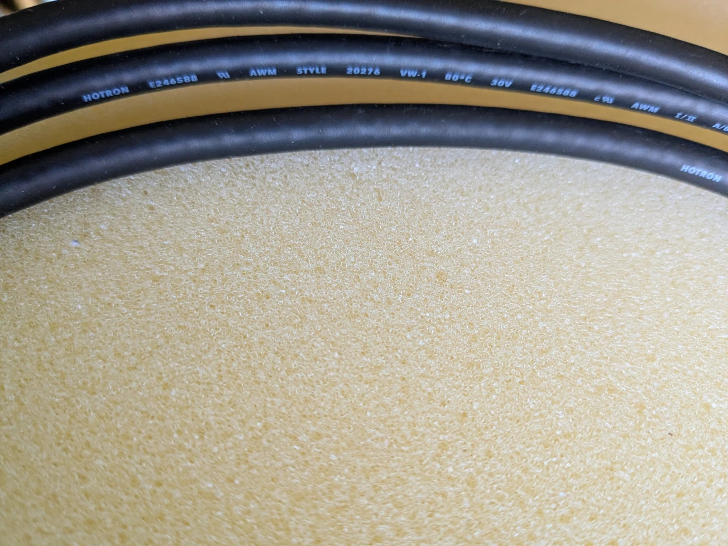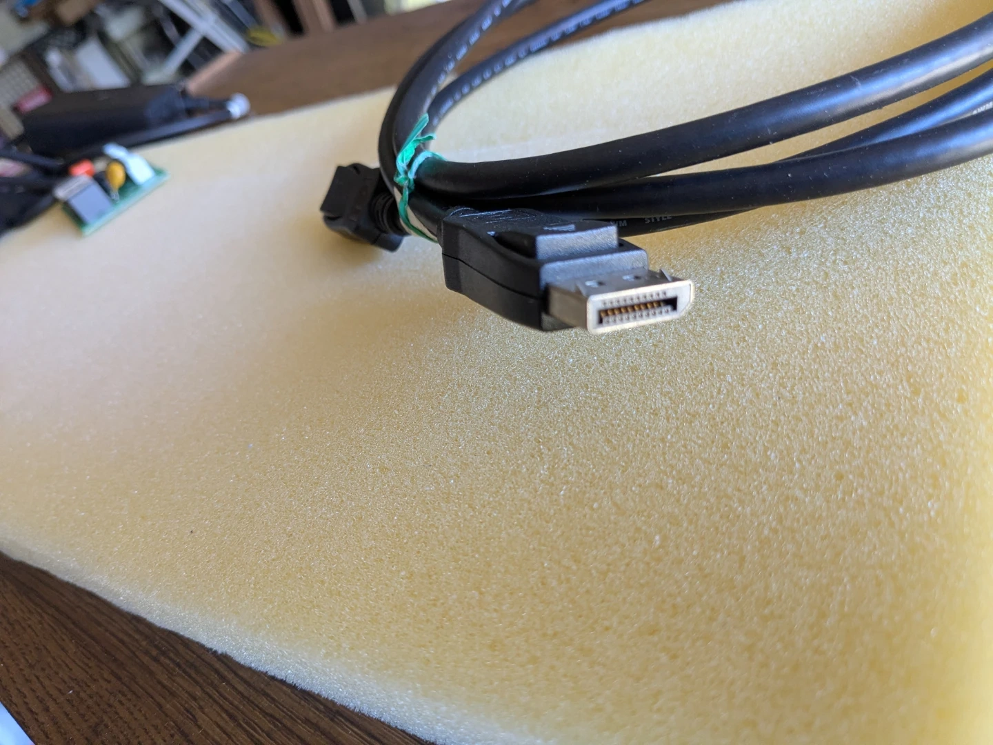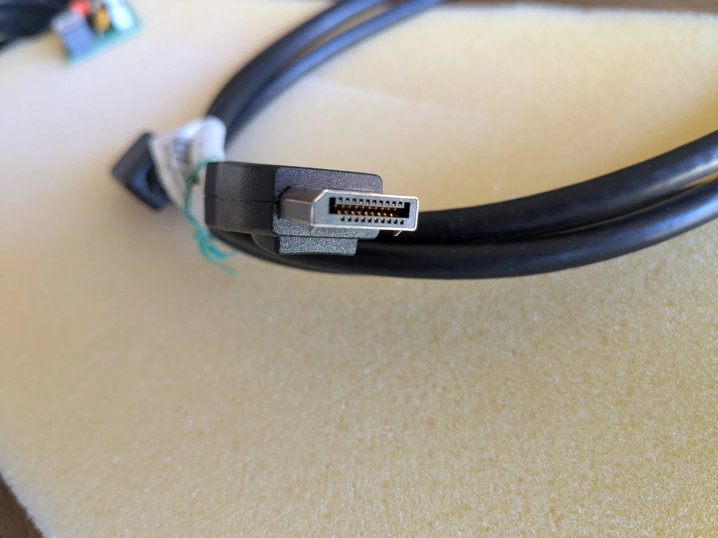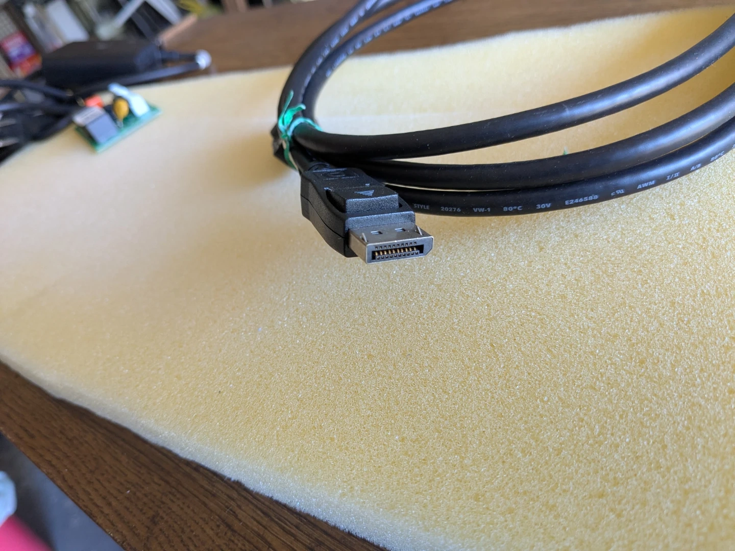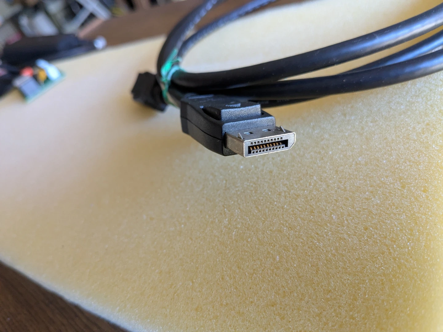 This is a DisplayPort cable. It has a DP? connector on one end and a USB-C? connector on the other. It's a black cable, approximately 6 feet long. Great for connecting monitors or displays!