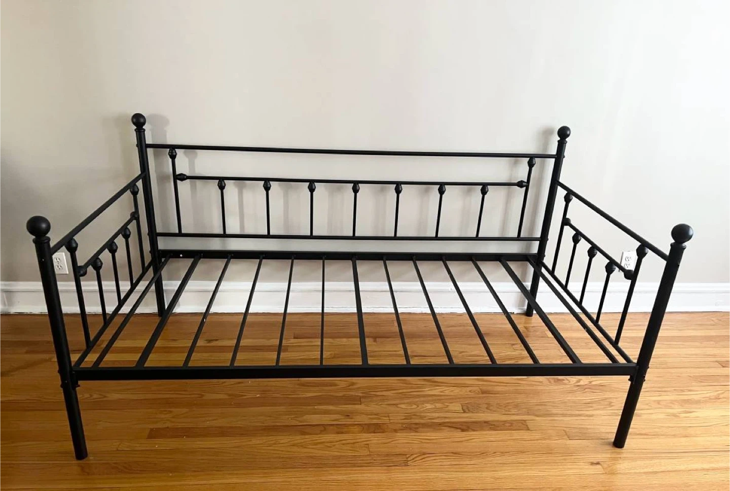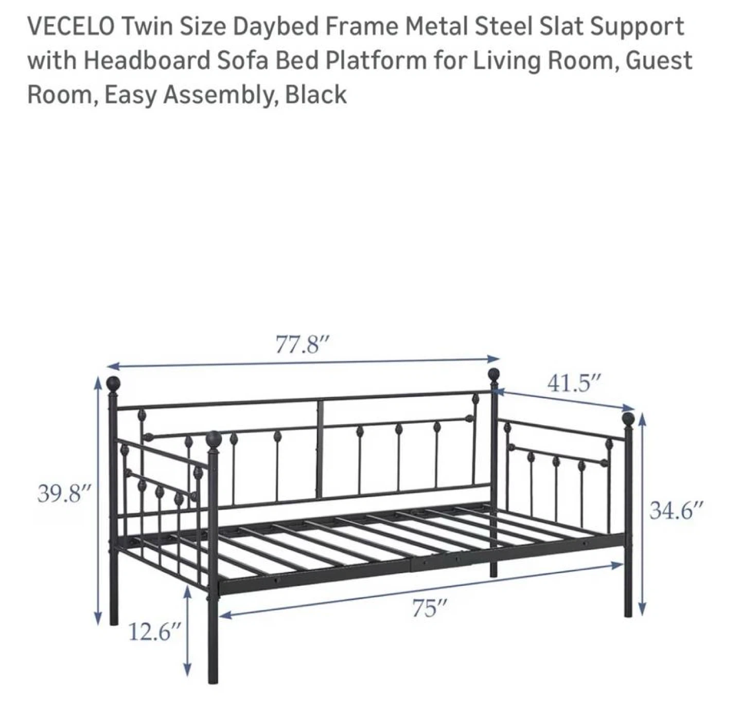 This is a VECELO twin size daybed frame. It's constructed from black metal with steel slat support. Measures 77.8" L x 41.5" W x 39.8" H. It's designed for easy assembly. Great for a living room or guest room!
