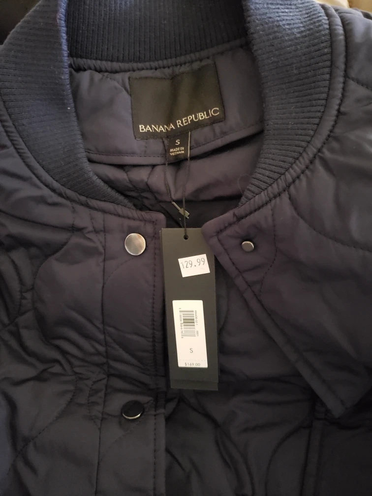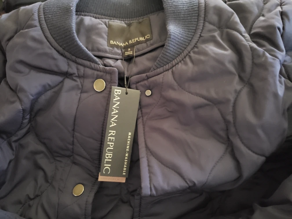 NEW Banana Republic quilted bomber jacket in size small! The jacket is machine washable. It's a very Sophisticated Dark Navy Color, and still brand NEW. Cash only please