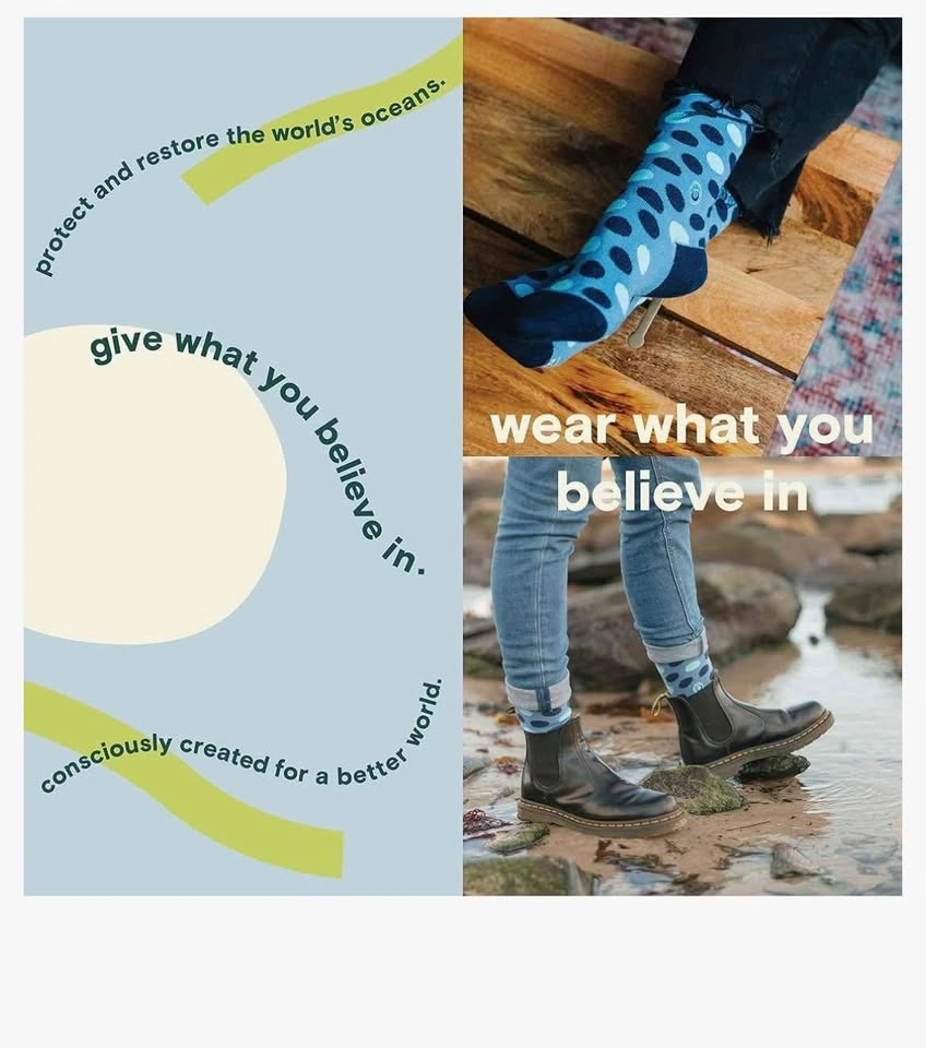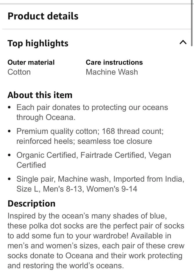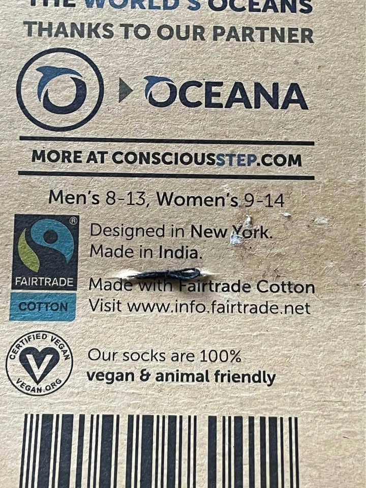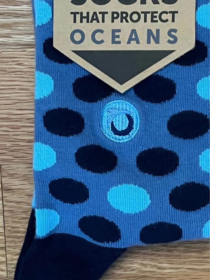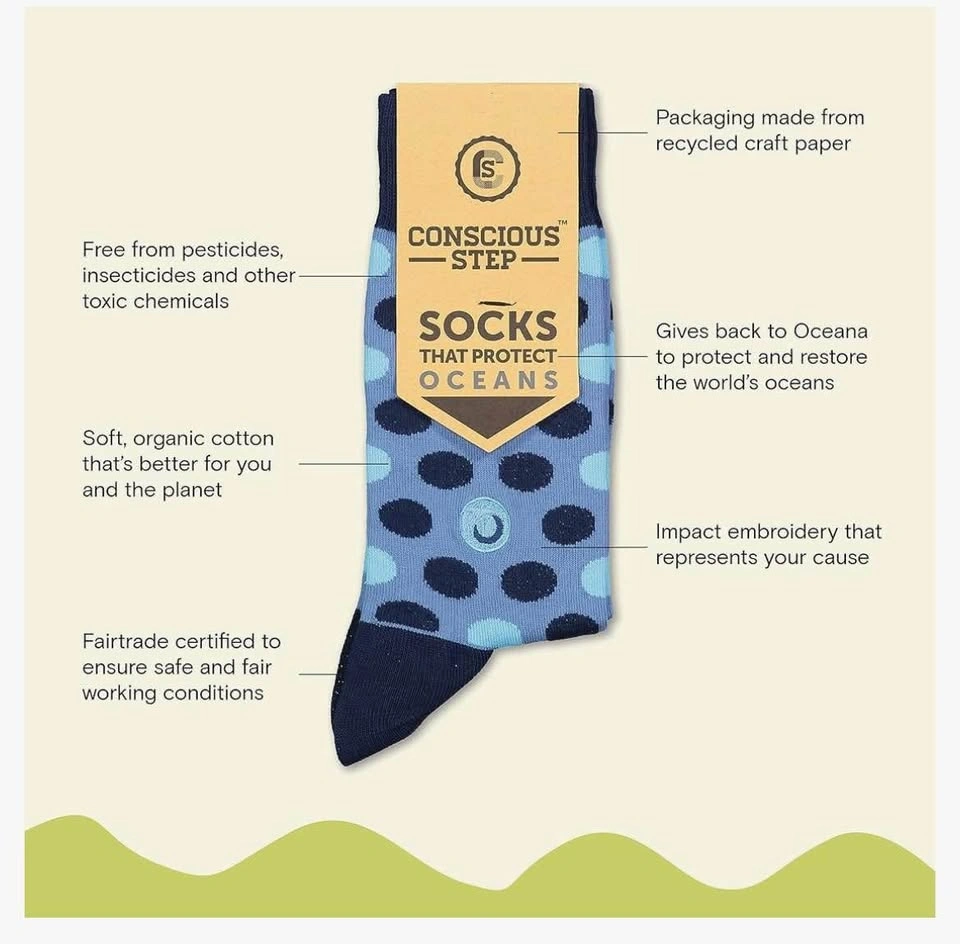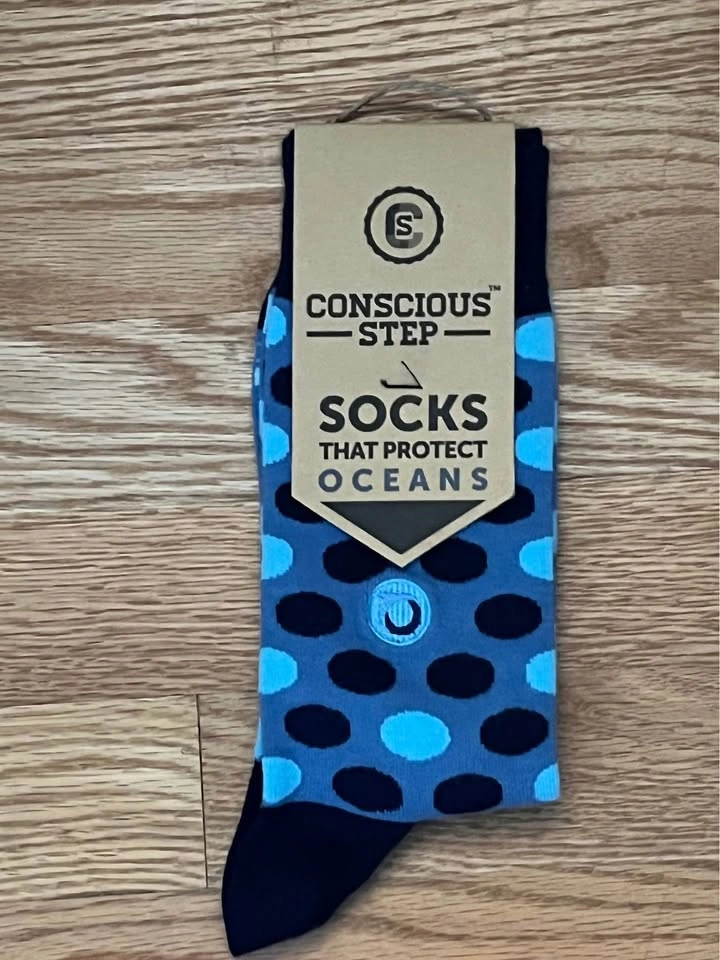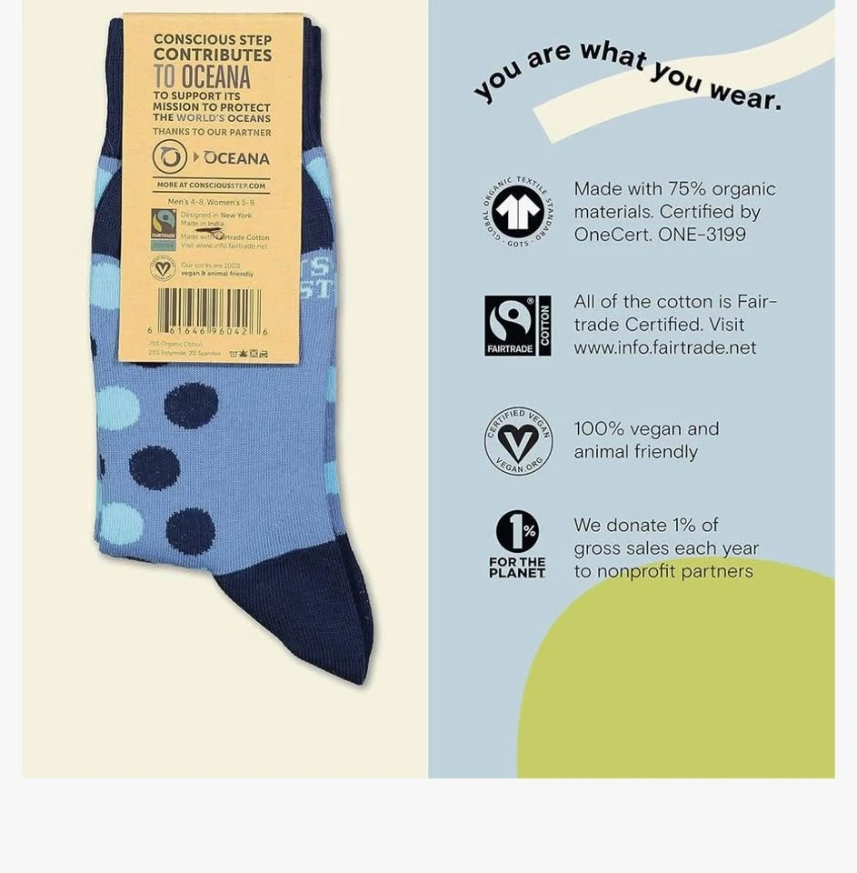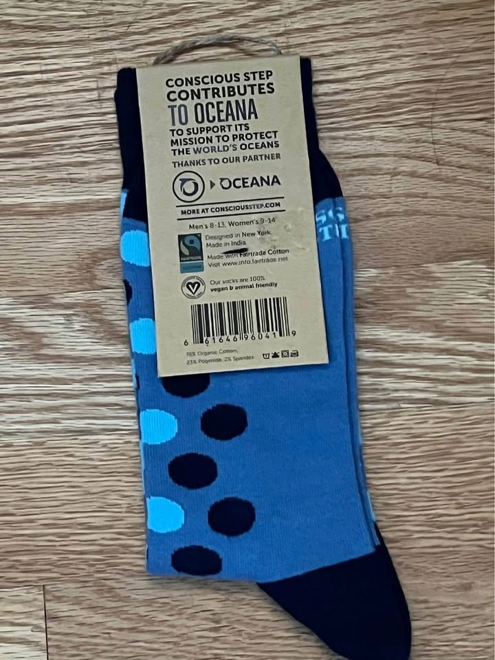60NWT Conscious Step blue socks. Men’s size 8-13 and women’s size 9-14. 168 thread count. Reinforced heels and seamless toe closure. Vegan certified. The original purchase price of $19 supports Oceana.