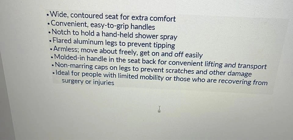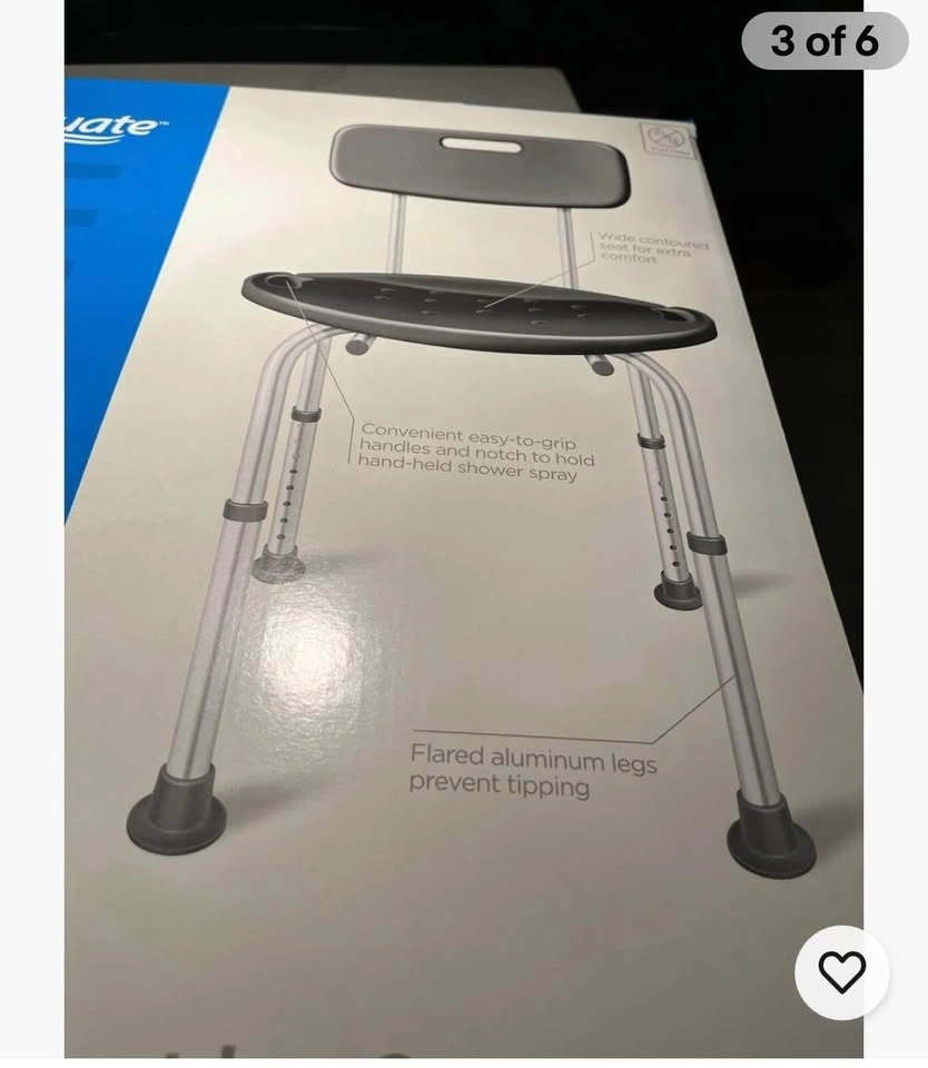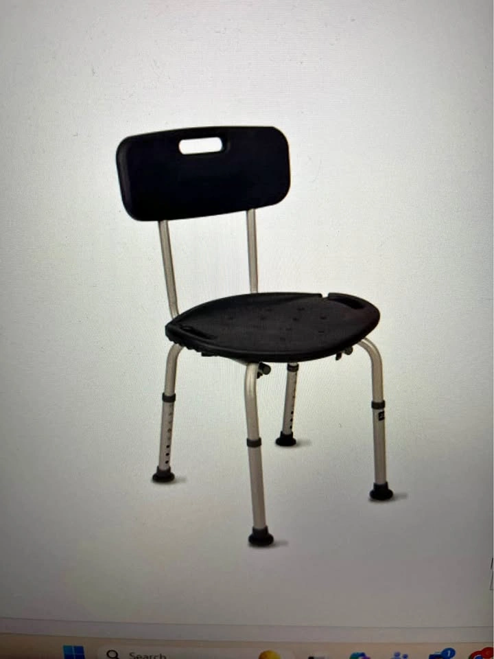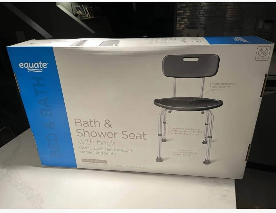 60NWT Equate black bath and shower seat with back. Holds up to 350 pounds. New in box. Seat height adjusts to 21”.