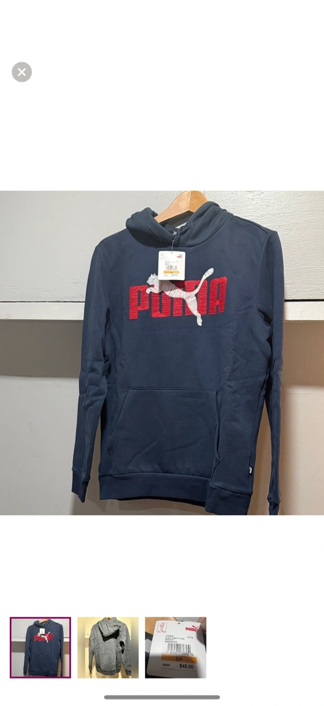 Selling a Puma Layered Graphic Hoodie in size S. It's in great condition and features a cool layered graphic design. Originally bought for $45! Brand new. Navy blue