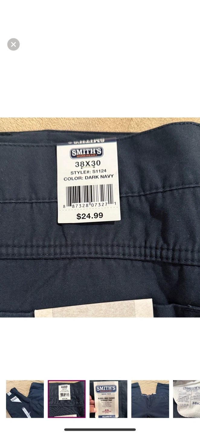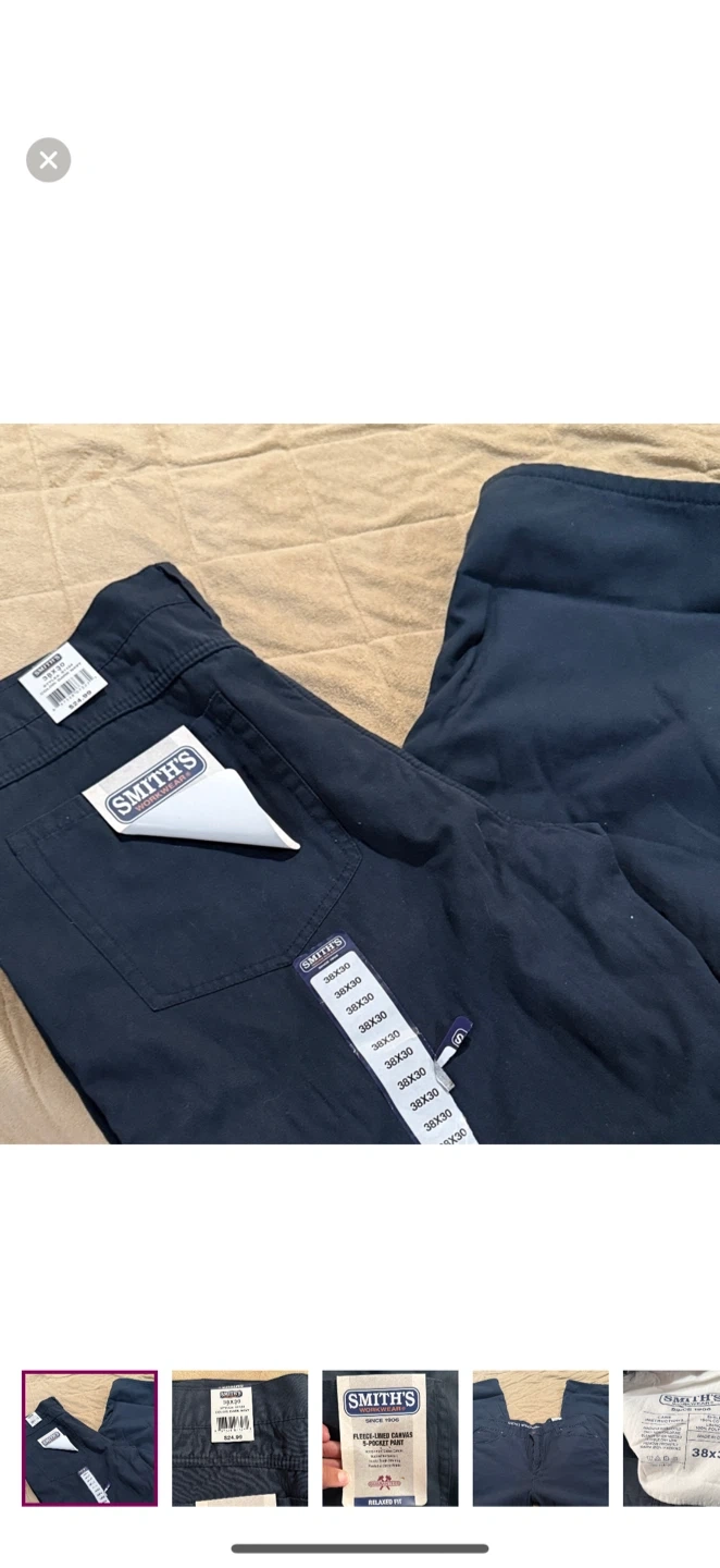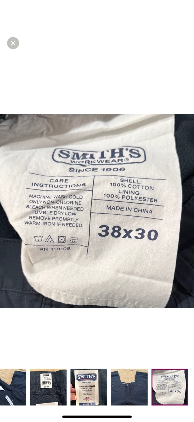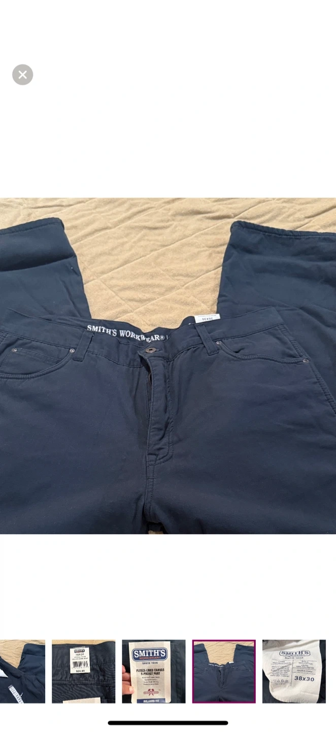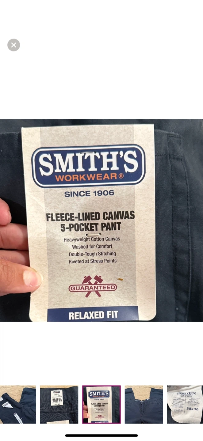 Smith's Workwear pants in size 38x30! They are a dark navy color. These are fleece-lined canvas 5-pocket pants, with heavyweight cotton canvas and double-tough stitching. They are also a relaxed fit! Originally bought for $24.99. Brand new