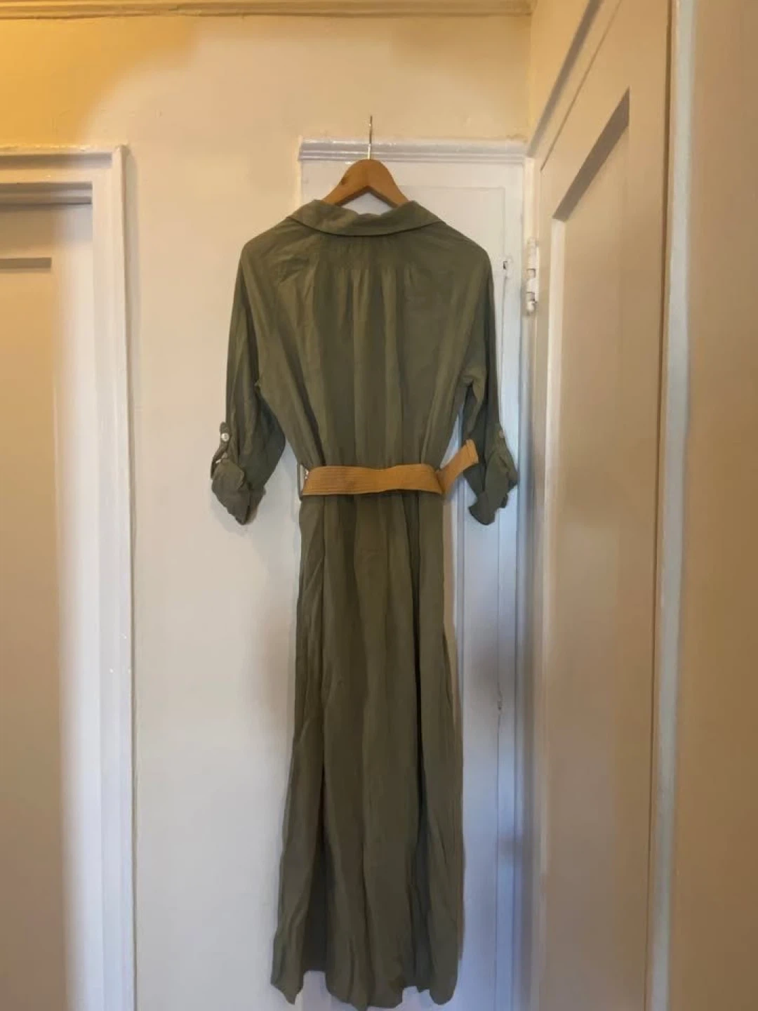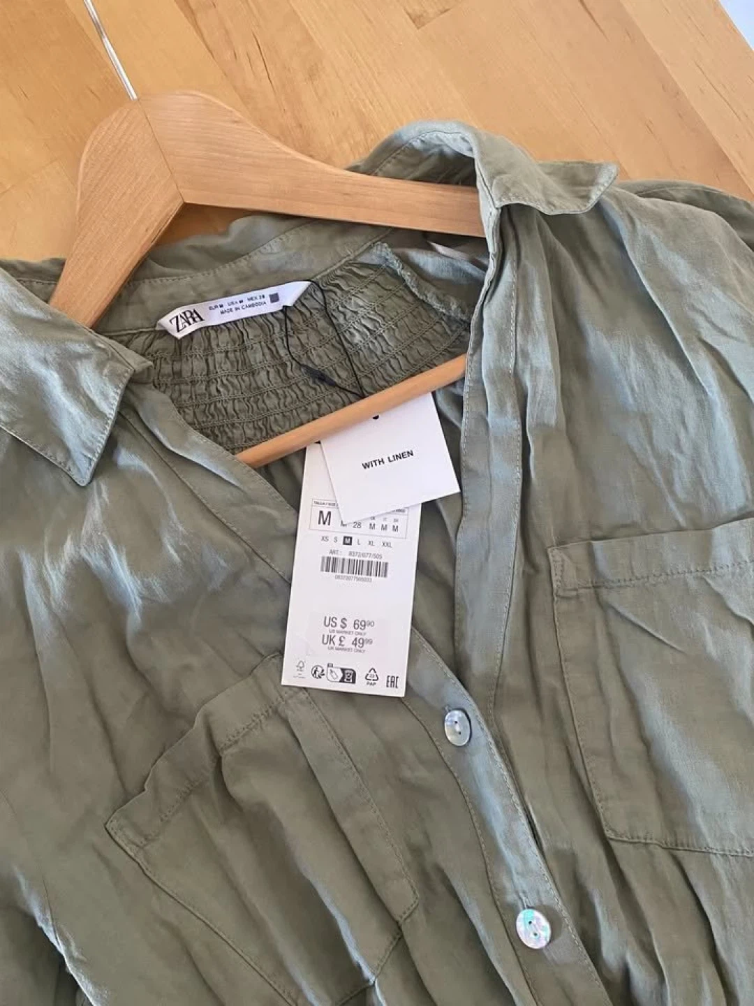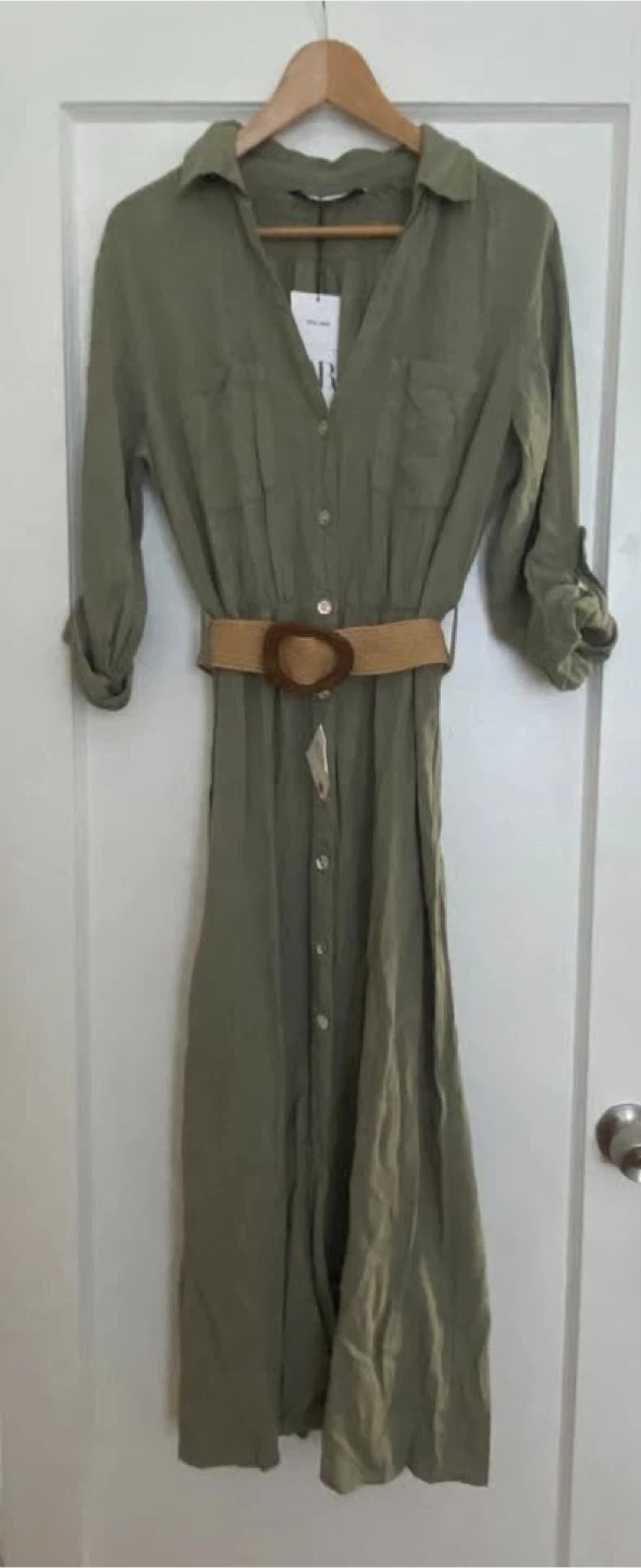 10Selling a NWT Zara shirt dress made with a linen blend. It's a size M and comes in a lovely olive green color. The dress also features a belt to cinch the waist. Originally bought for $69.90!