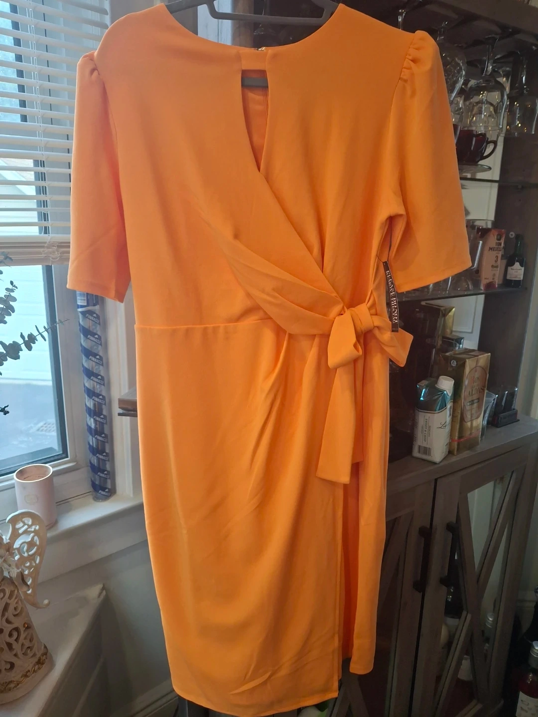 60Selling a vibrant orange wrap dress from NY & Company! It features a stylish tie at the waist and short sleeves. Perfect for adding a pop of color to your wardrobe!