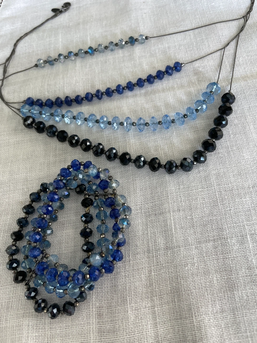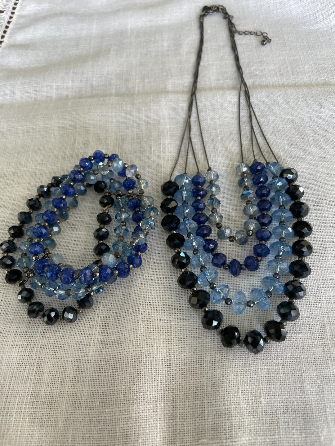65Beautiful NY necklace and bracelet set featuring a mix of blue and black beads. Perfect for adding a touch of elegance to any outfit! Like new condition!