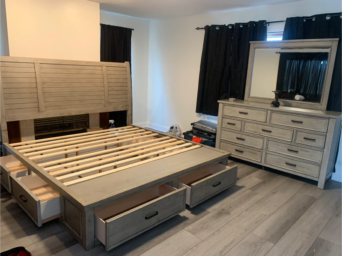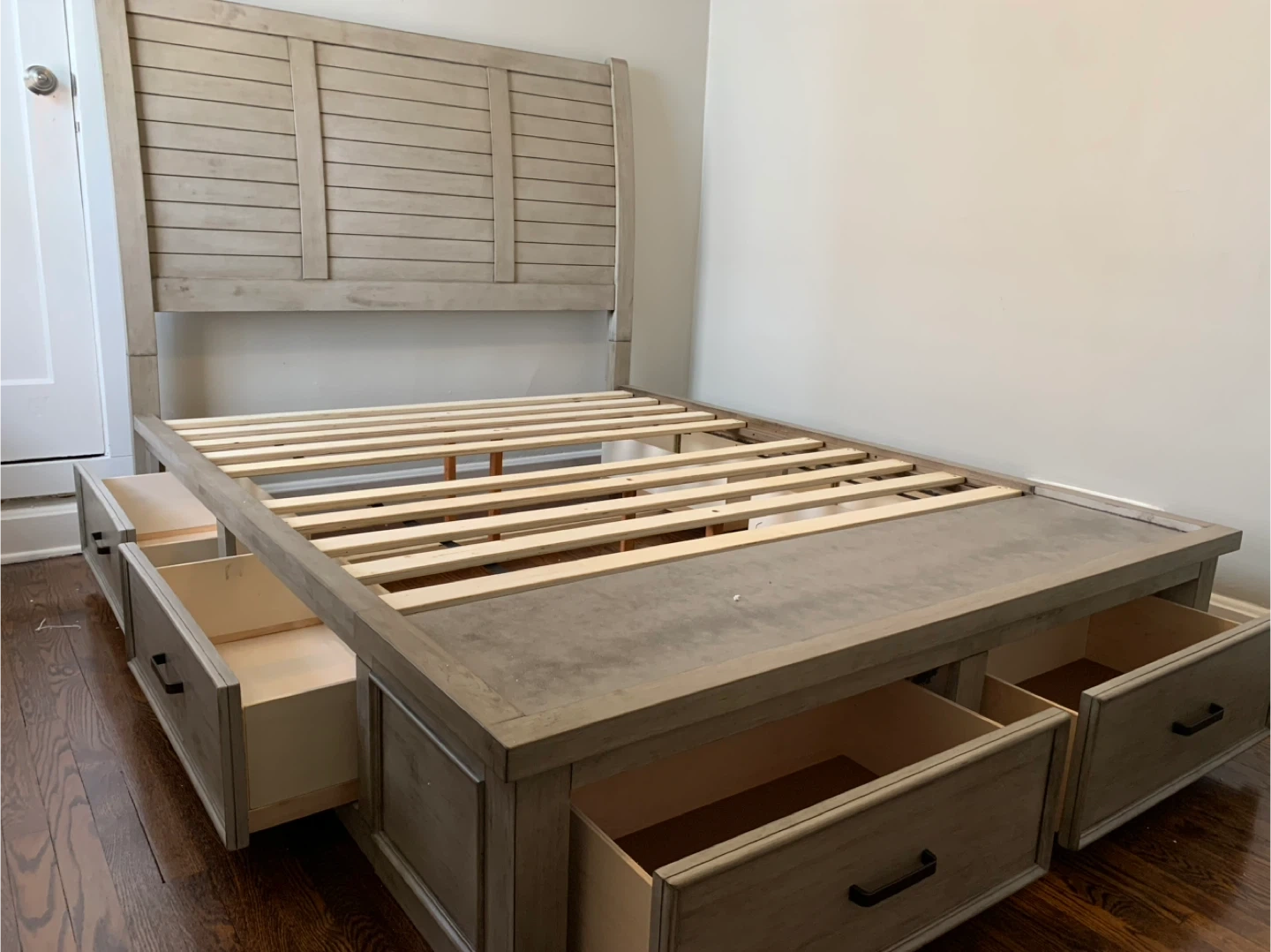 This platform bed frame features a distressed wood finish and six spacious storage drawers. It includes a headboard and a slatted support system for your mattress. Perfect for bedrooms needing extra storage!