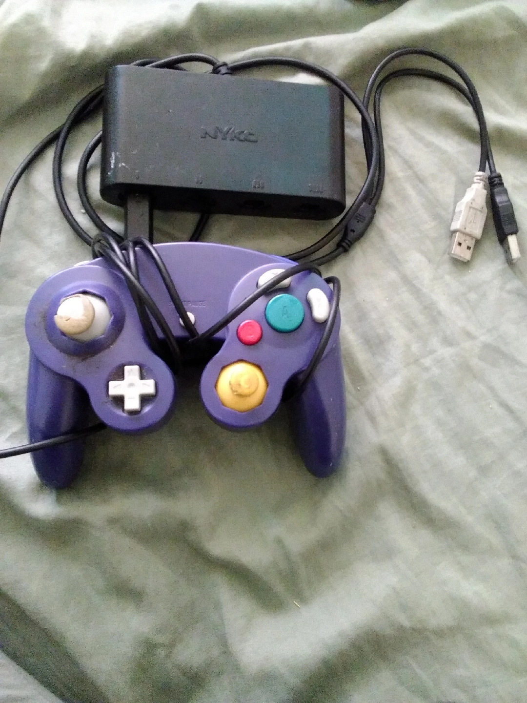 10Selling a purple GameCube controller and a Nyko adapter. Both show signs of use.