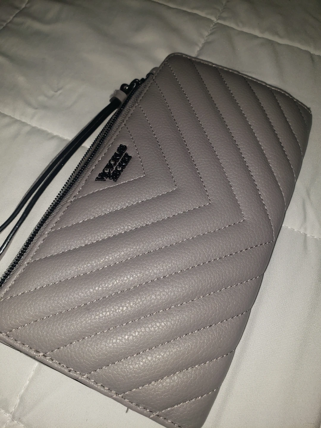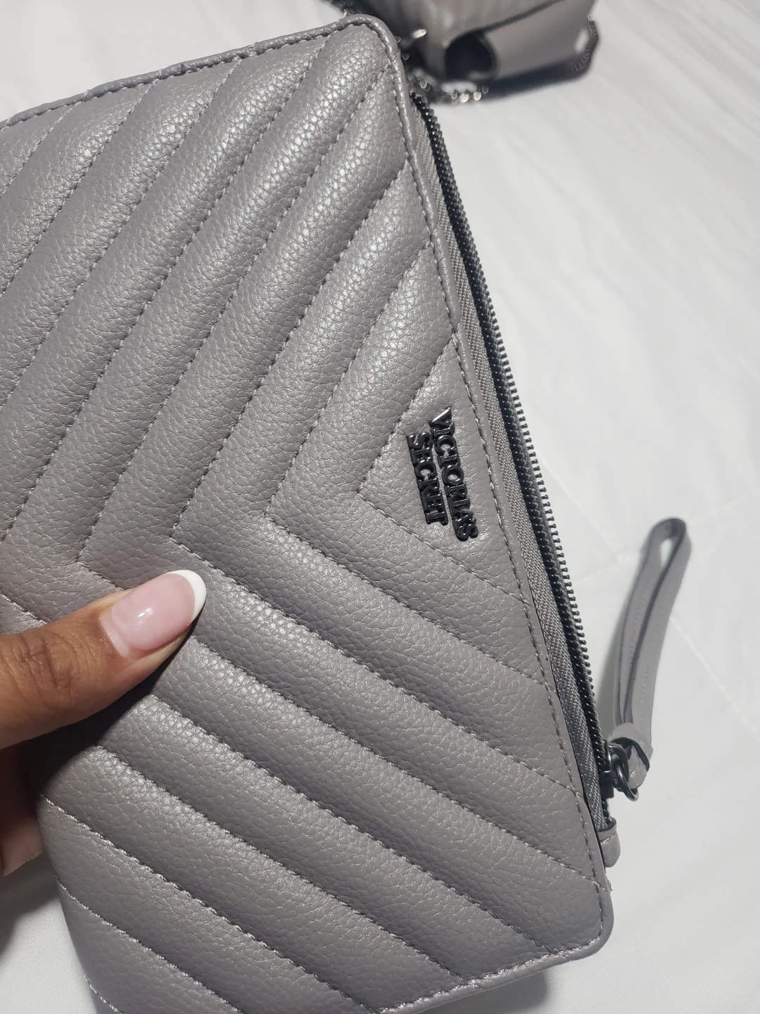 This Victoria's Secret wristlet wallet comes in a stylish gray with a chevron quilted design. It features a zip-around closure and a removable wrist strap. Interior details include multiple card slots and a zippered pocket.