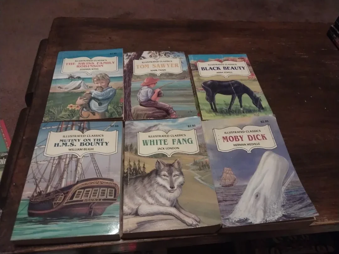Collection of six classic novels from Illustrated Classics. Titles include Moby Dick by Herman Melville, Tom Sawyer by Mark Twain, White Fang by Jack London, Mutiny on the H.M.S. Bounty by William Bligh, The Swiss Family Robinson by Johann Wyss, and Black Beauty by Anna Sewell. These are great reads for anyone interested in timeless literature! Pocket sized 4.5" x 6"