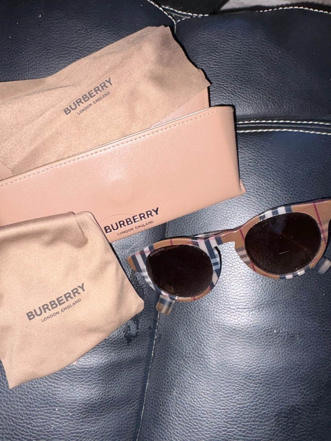 Burberry sunglasses with a plaid pattern. Includes original case and dust bags. Made in Italy. Perfect for sunny days!