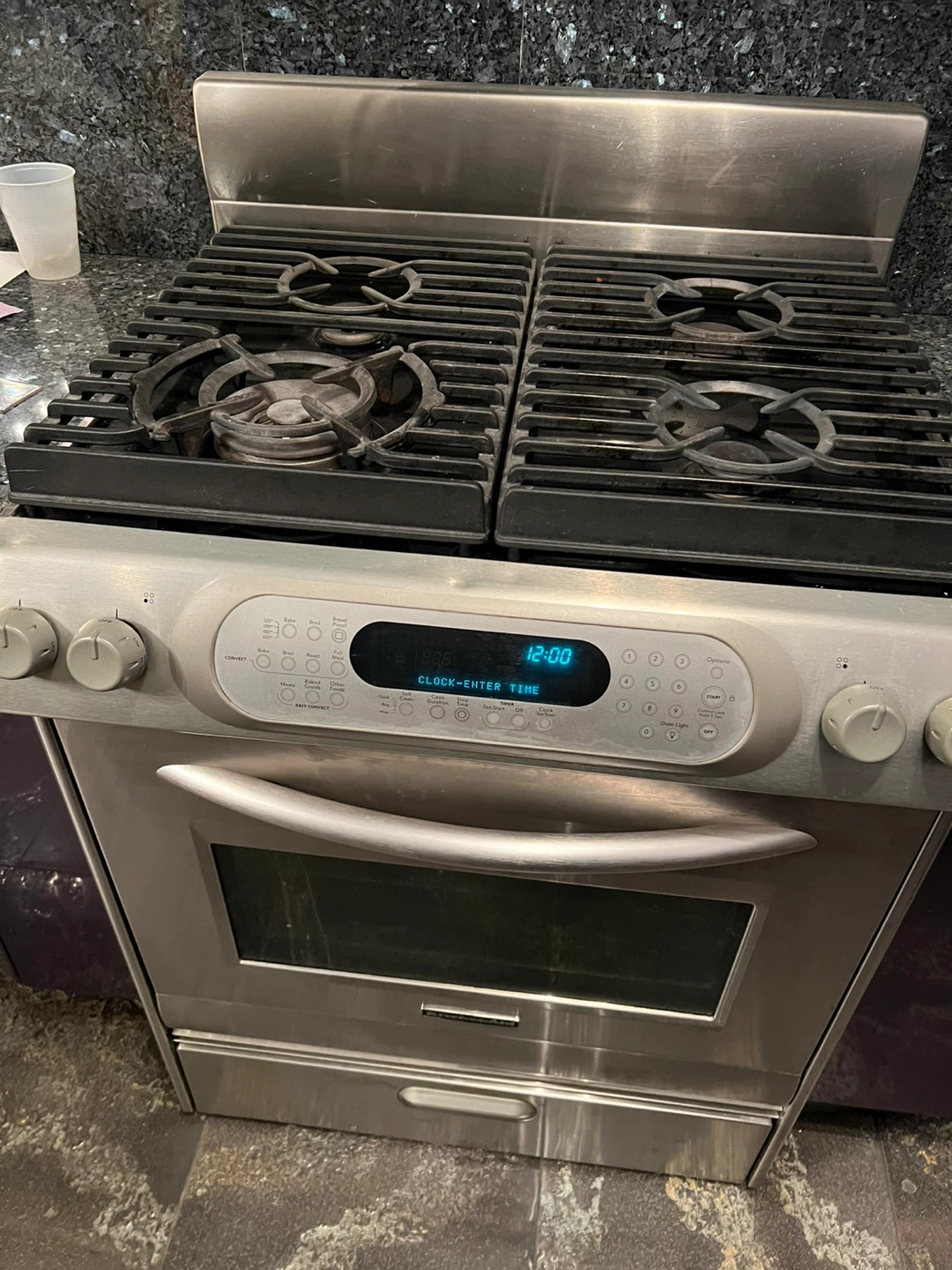 Selling a KitchenAid stainless steel gas range. It's in good condition and ready for use! This range features a spacious oven and a cooktop with multiple burners. One of the burners provides gas but doesn’t light up, perfect for cooking up delicious meals.