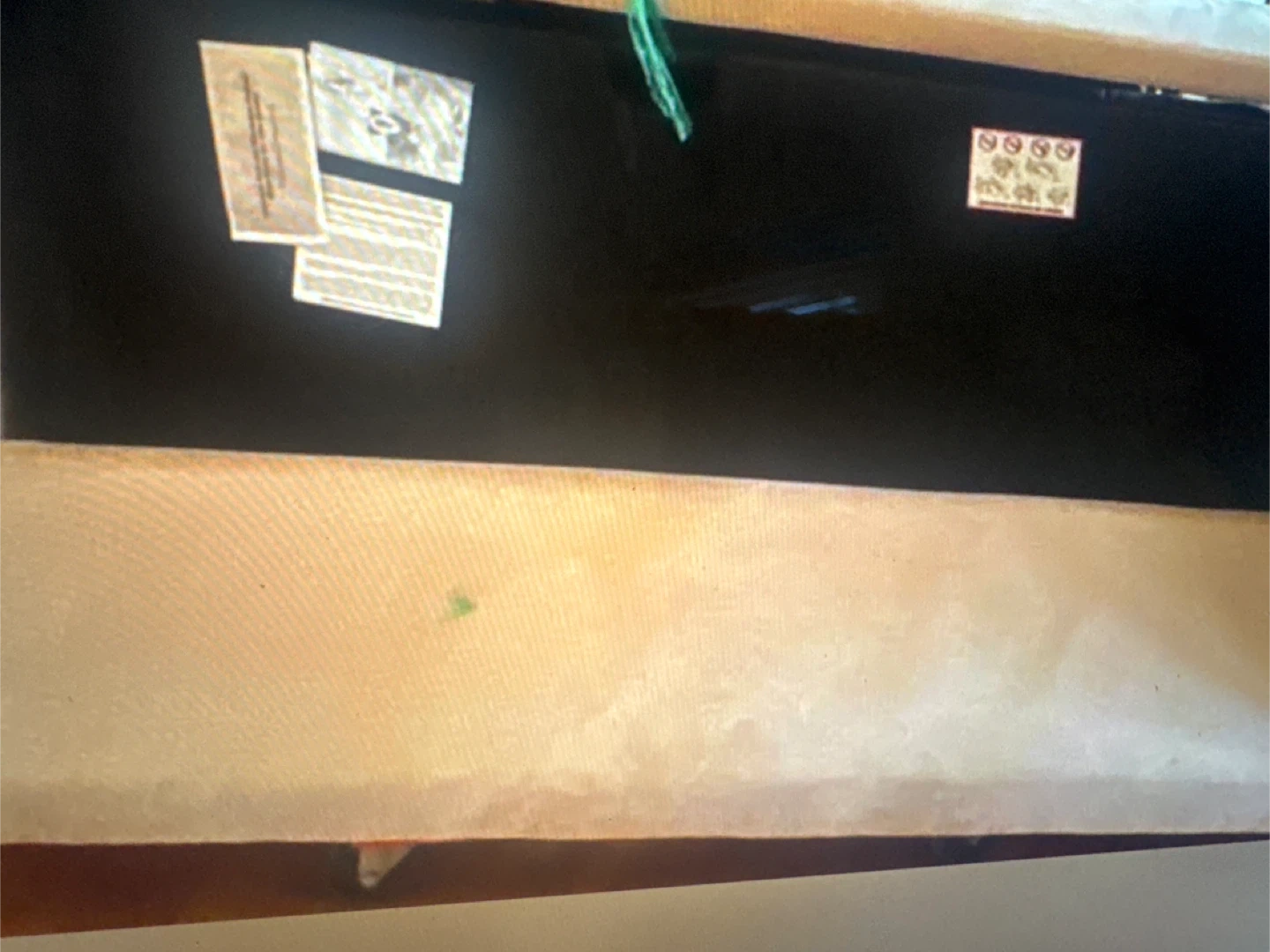 Klaussner sofa with multiple throw pillows. Upholstery is a light tan color. Includes care instructions for fabric and leather.
