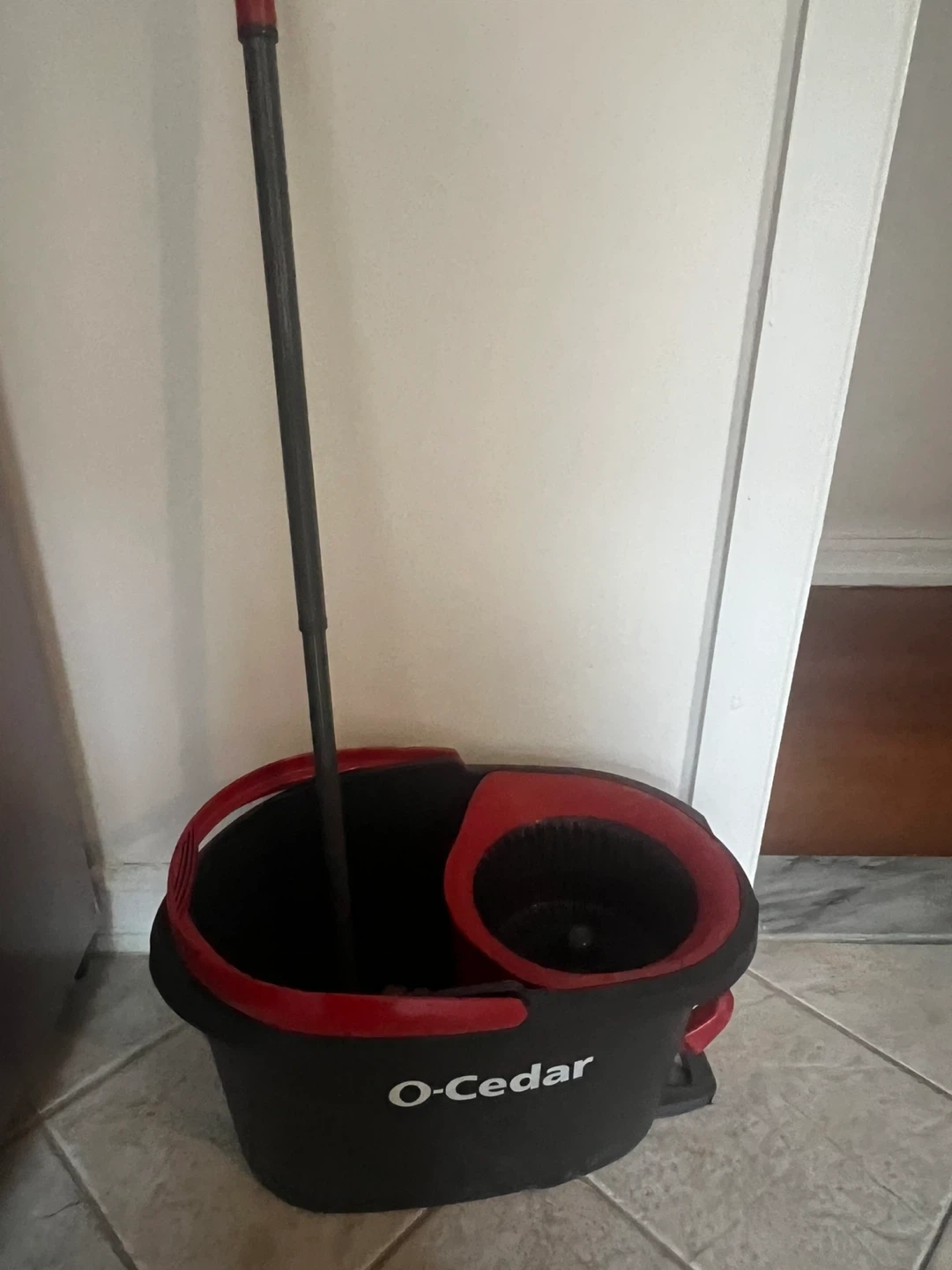 136I'm selling an O-Cedar EasyWring Spin Mop and Bucket! This mop makes cleaning easy with its hands-free wringing system. The microfiber mop head is great for all floor types, and the built-in splash guard keeps water in the bucket while wringing. It's in good condition and ready to help you keep your floors sparkling!