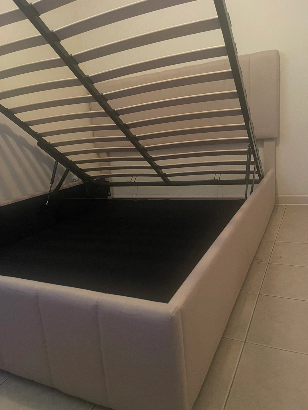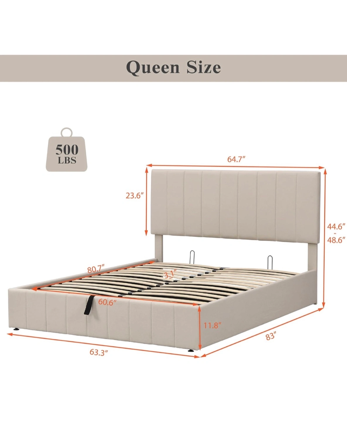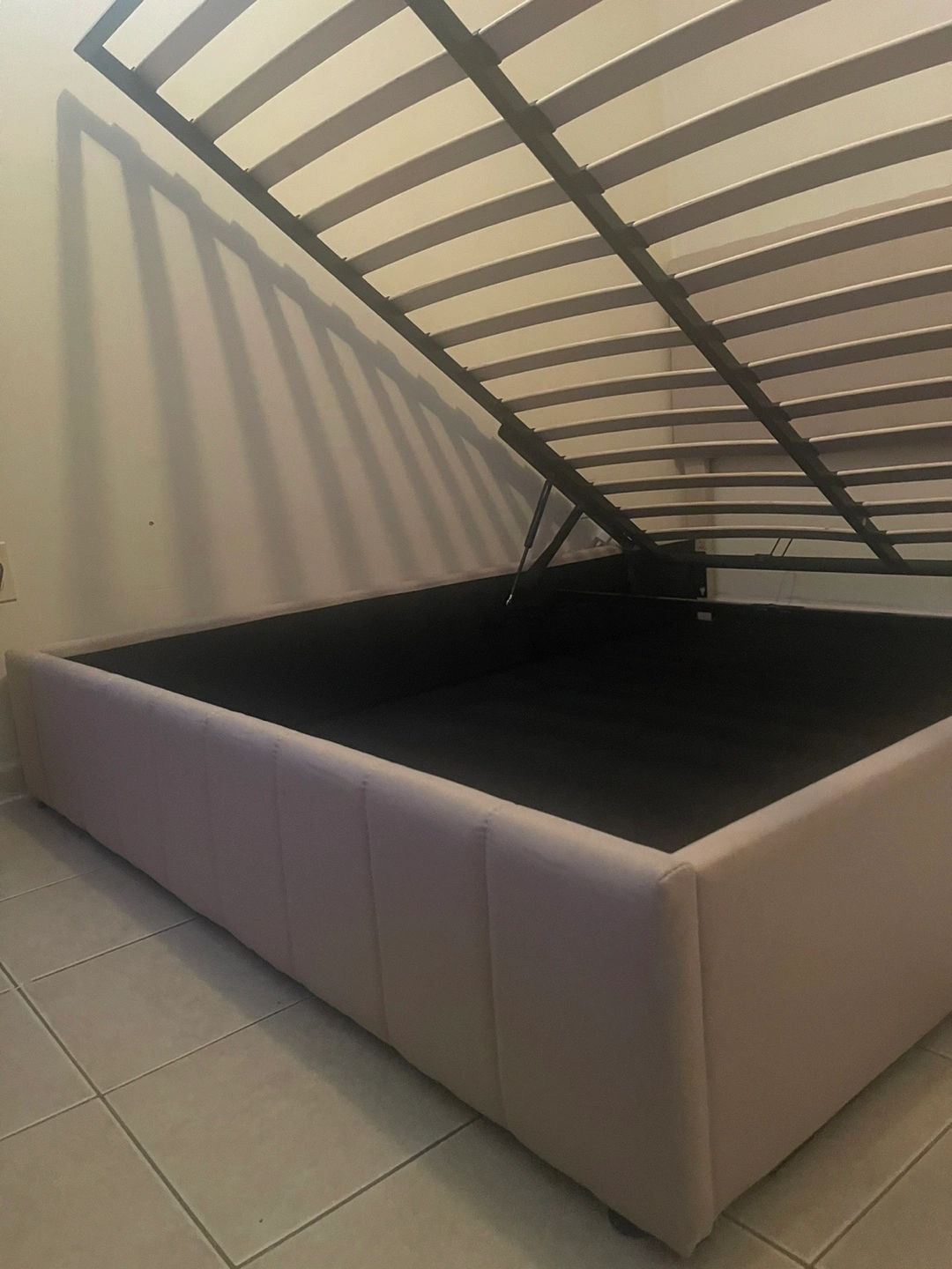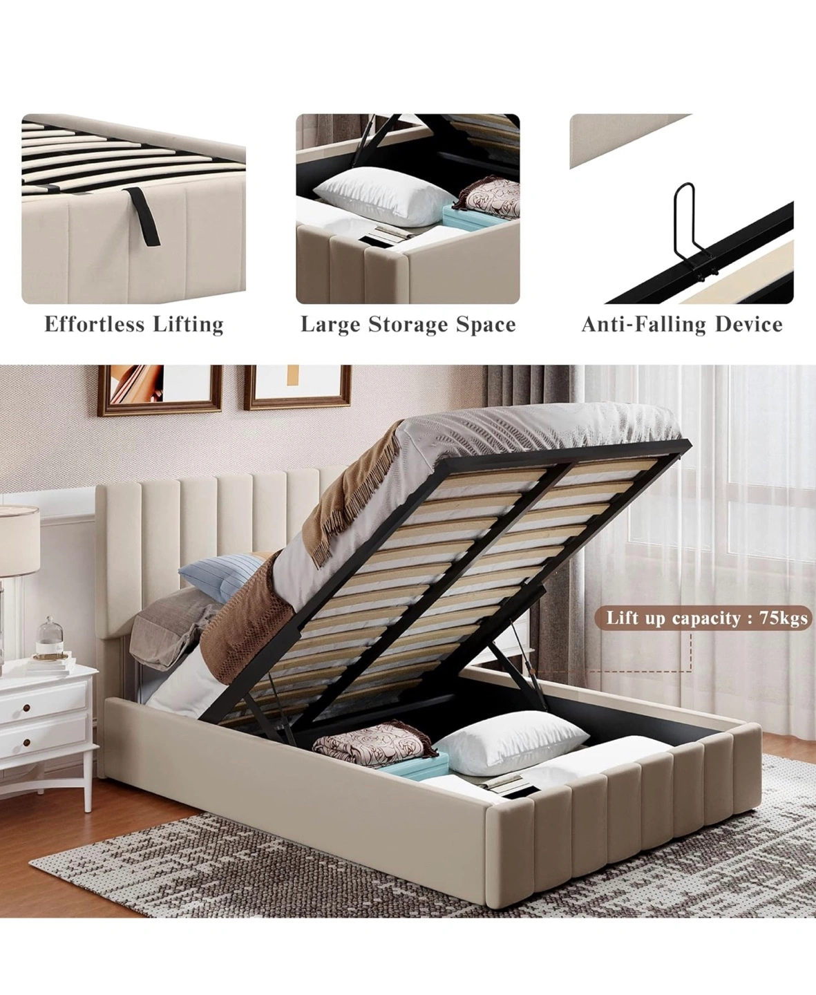 Beige Gas Lift Up Storage Platform Queen Bed Frame