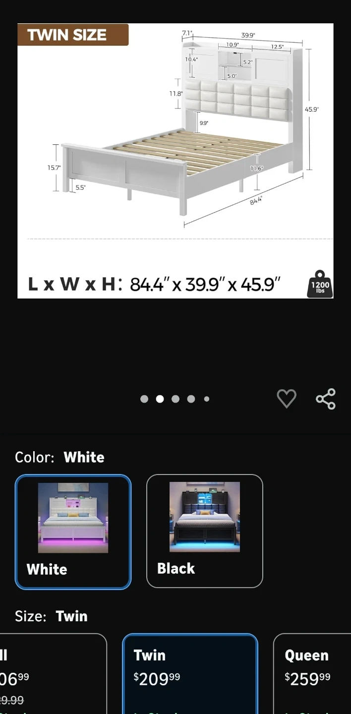 Selling a Rolanstar twin size bed frame in white! It features a charging station, bookcase headboard with LED light and sliding doors. Platform bed with wooden slats, so no box spring is needed! Dimensions are 84.4" x 39.9" x 45.9".