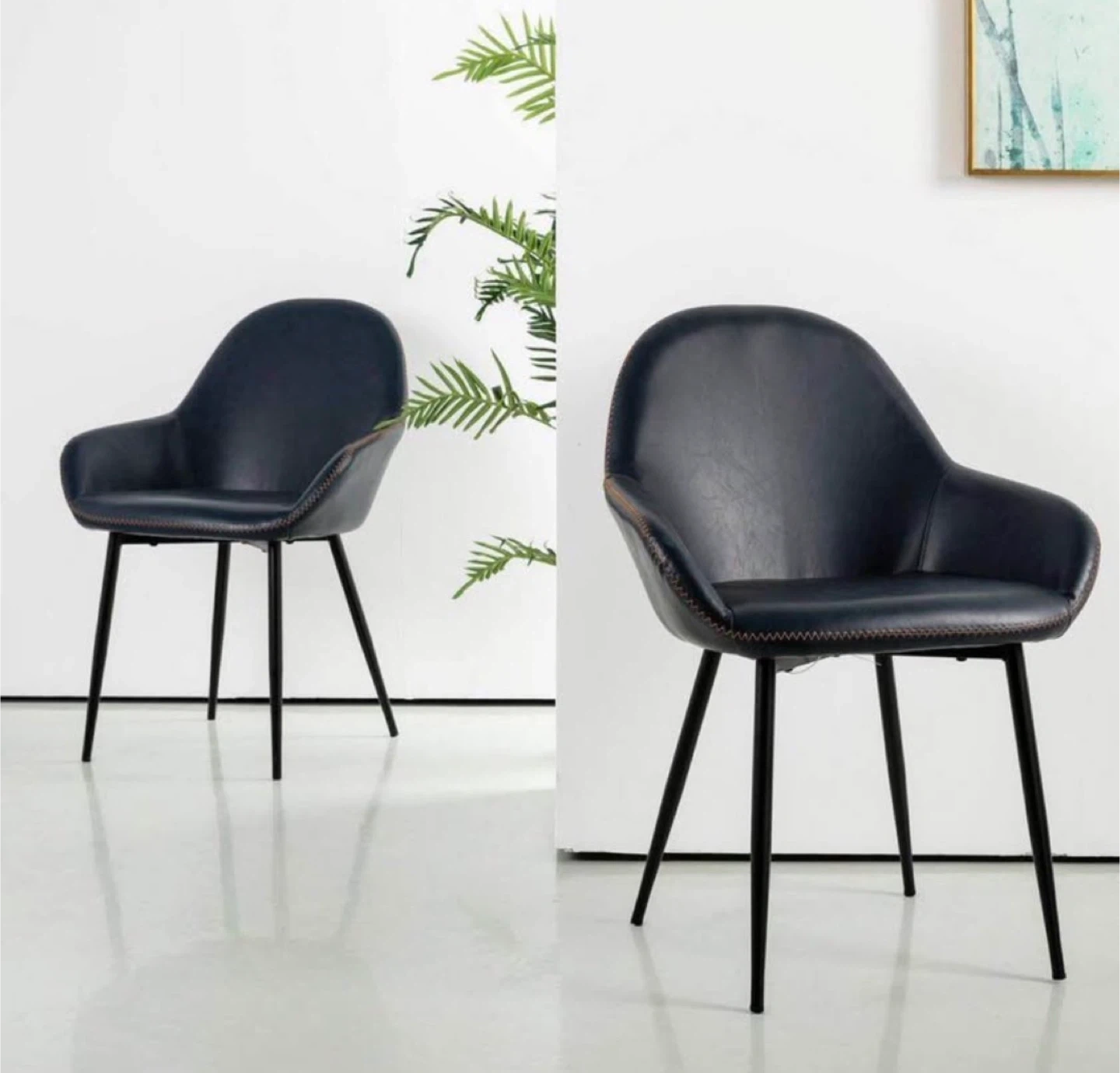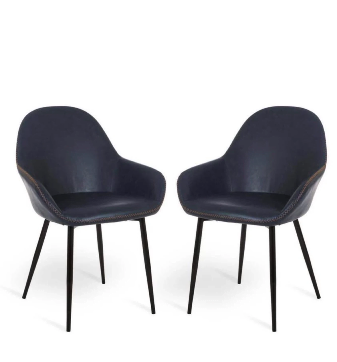 This set includes four stylish dining chairs upholstered in dark blue faux leather. They feature contrasting stitching along the edges and sturdy black metal legs. Seat height is 18.5in / 47cm.