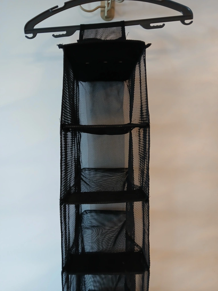 2. 3 cube organizer. Measures about 30" long. Each cube measures 11" × 9". Velcro Hanger can be hung on Rod or Hanger to Rod. It is made of a mesh fabric. It would be great to hang in a closet to organize shoes, clothes, or accessories.
