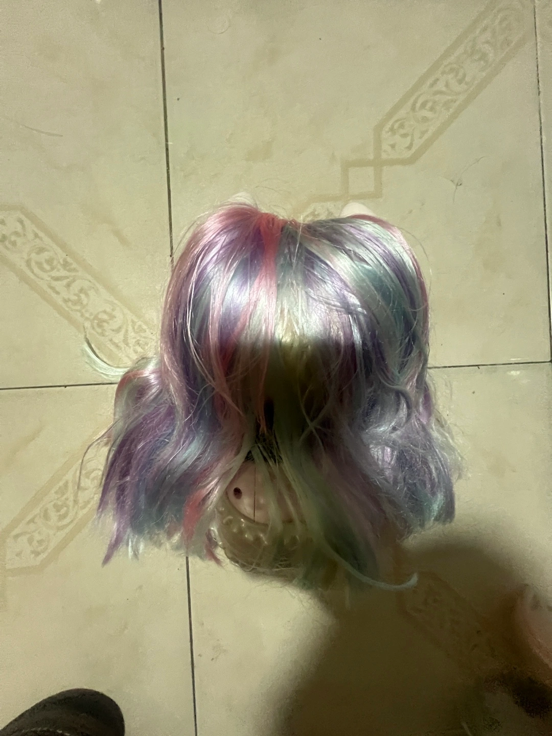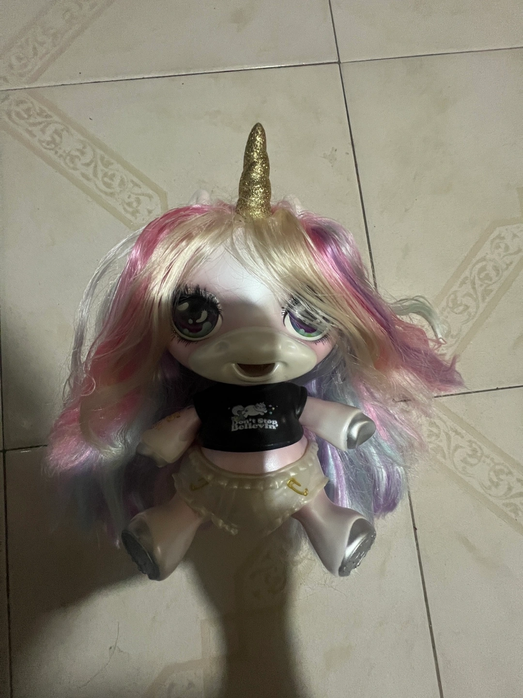 Unicorn doll. Features a golden horn. Adorned with colorful hair. Perfect for any child to hold and cherish.