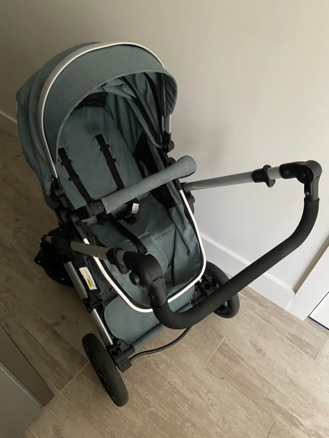 This is a stroller with a matching quilted diaper bag. It's a dark green color and has a reversible seat. The stroller includes a 5-point harness for safety. It's perfect for on-the-go parents!
