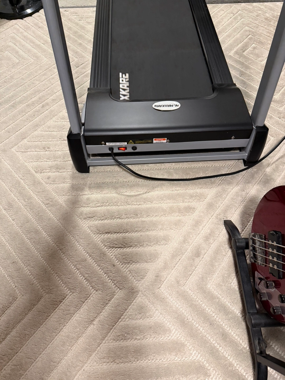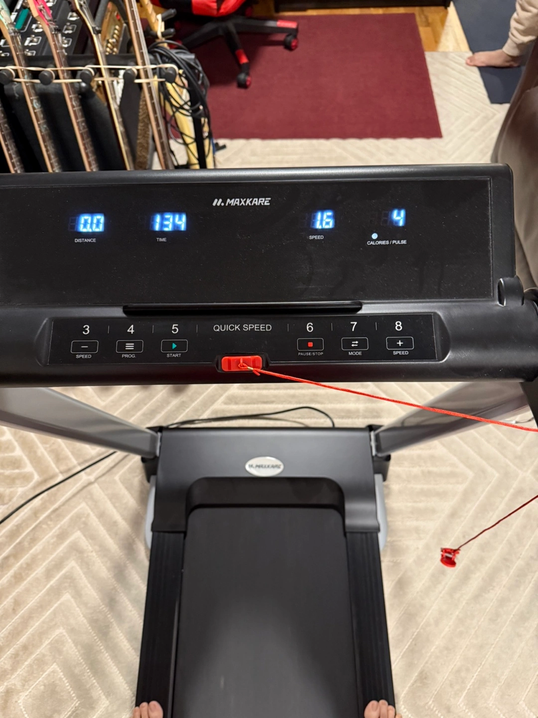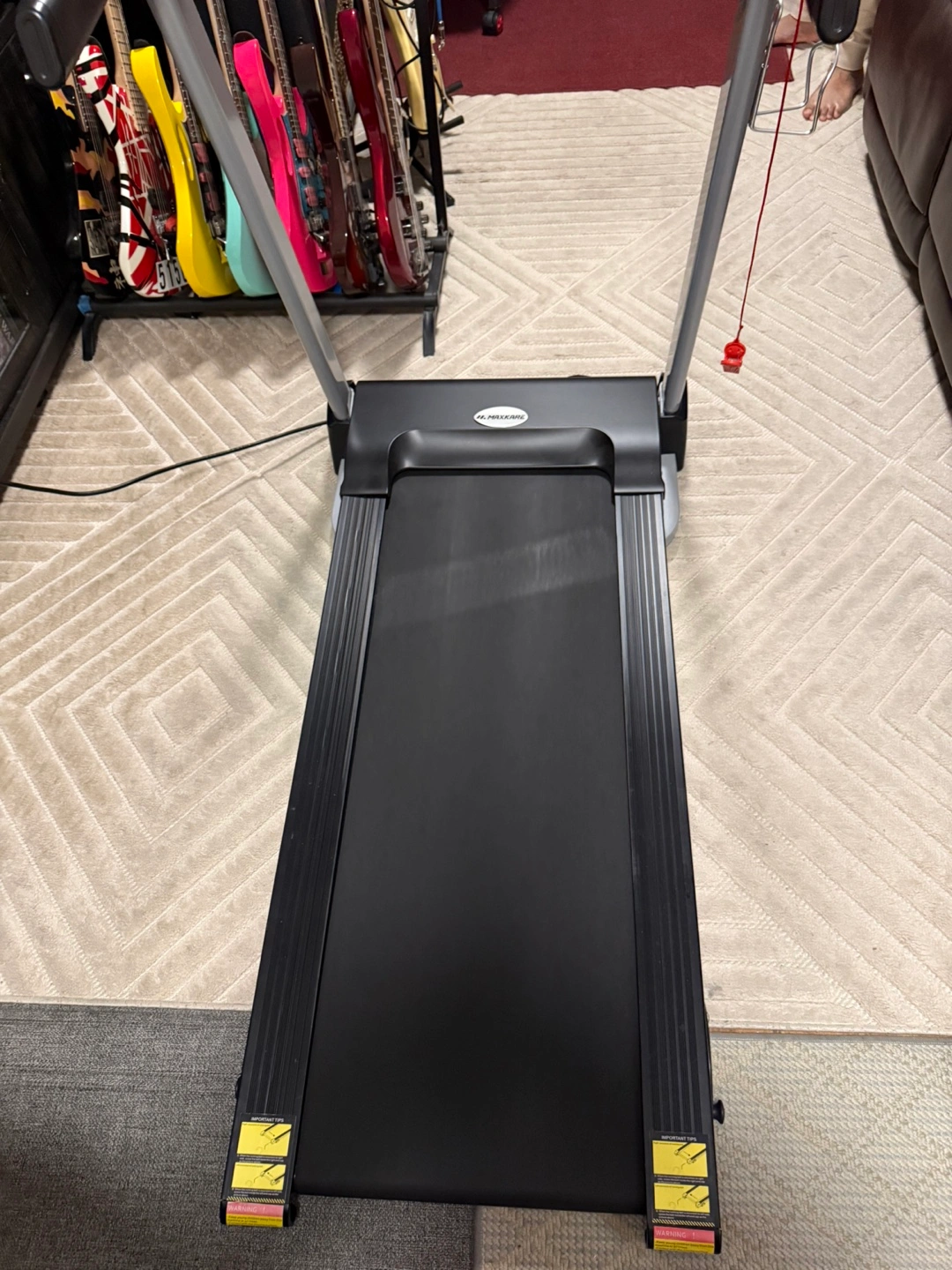 Compact treadmill, folds for storage. Good condition, some wear. Includes safety clip. Digital display shows speed, time, distance, calories burned, and pulse.