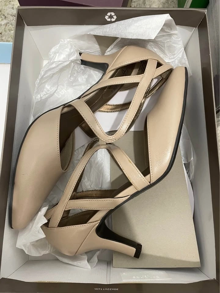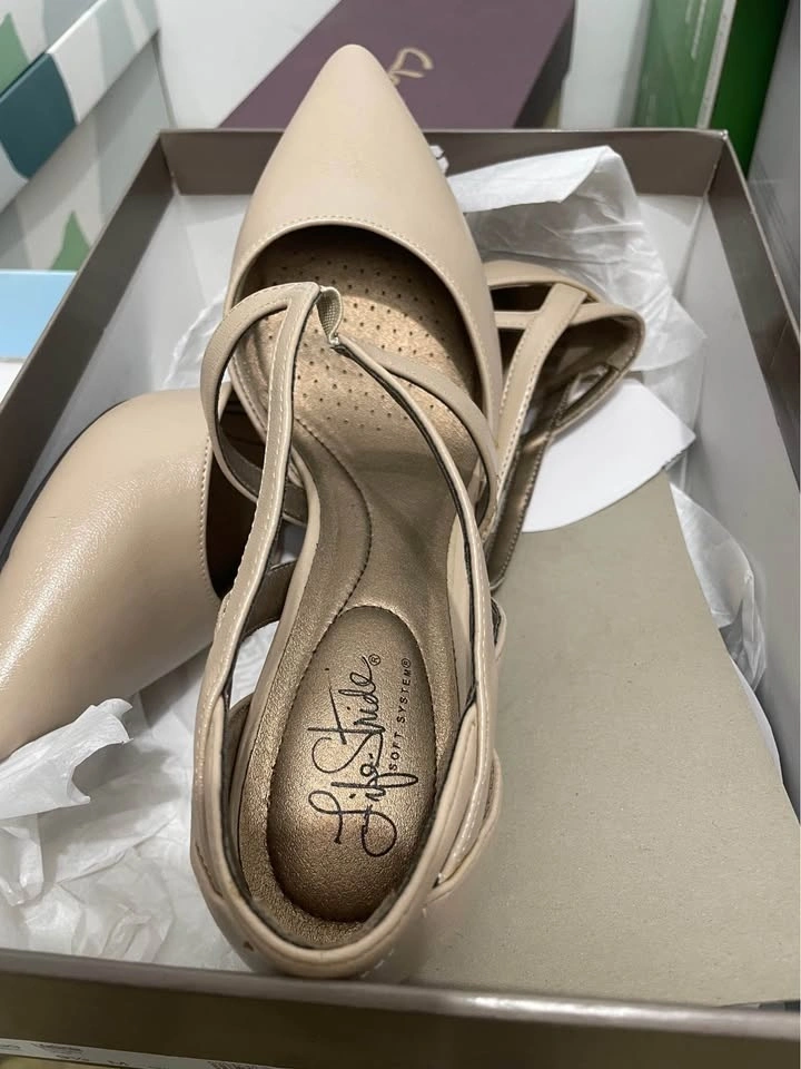 Stylish LifeStride heels. Nude color, pointed toe with cool criss-cross straps. Has Soft System tech and Flex sole for comfort. Looks almost new!