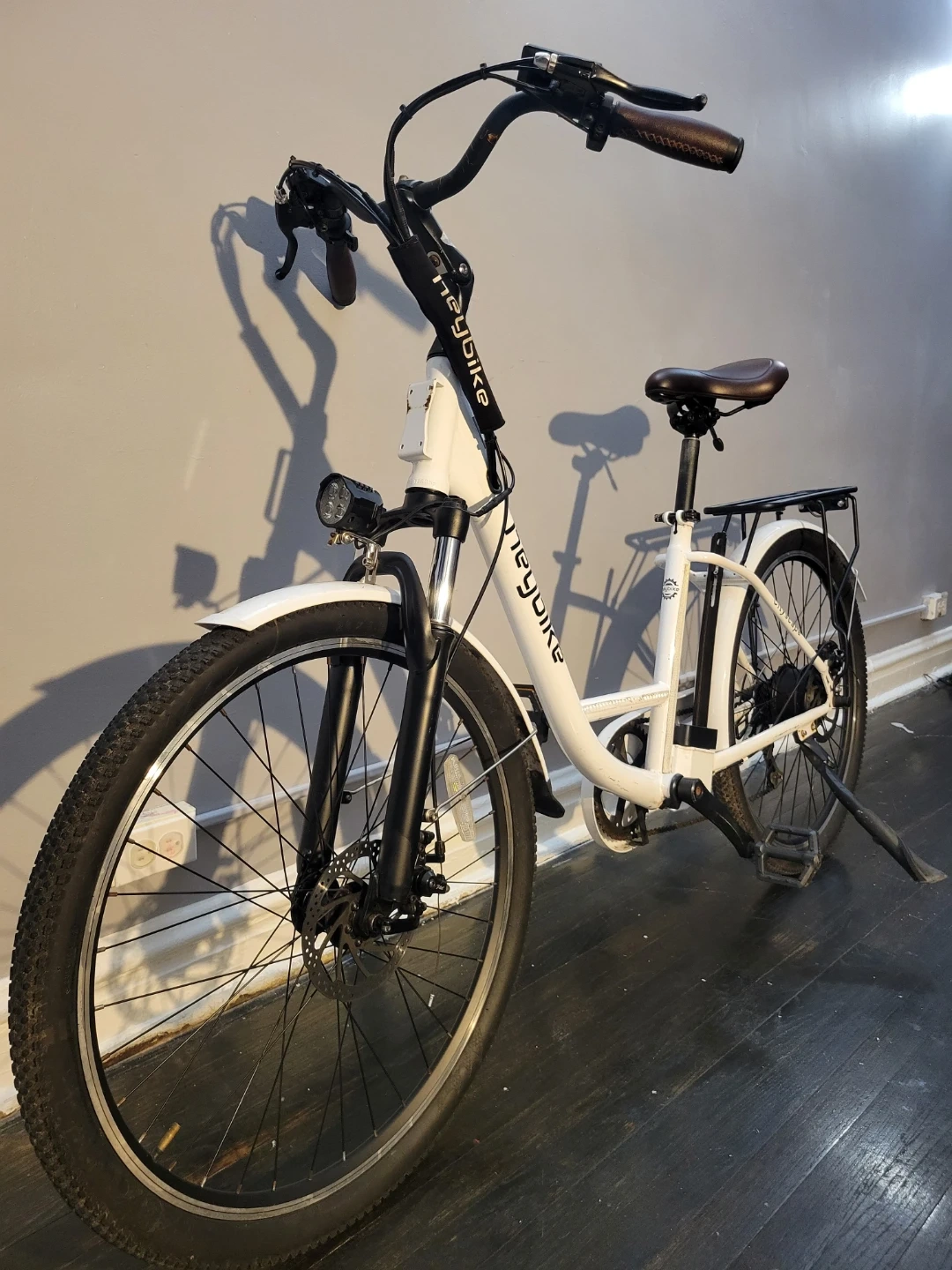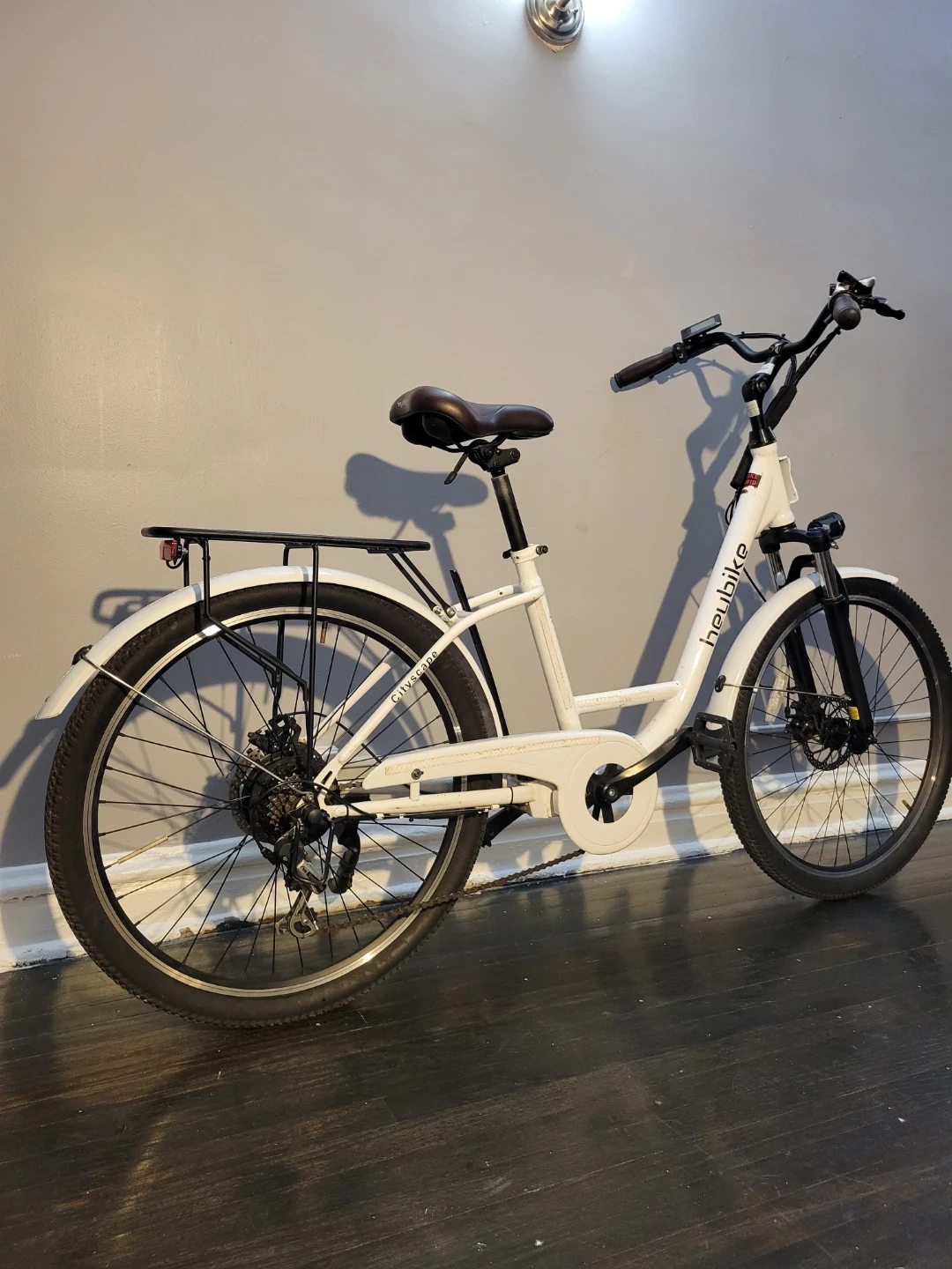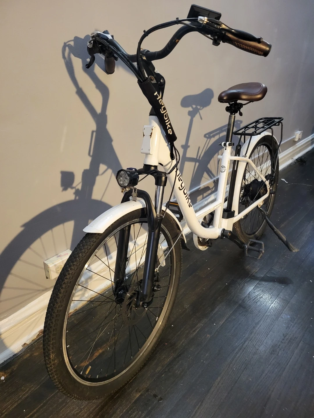 This is a white Heybike electric city cruiser bike. It's a step-through frame design. It includes a rear rack and front headlight.